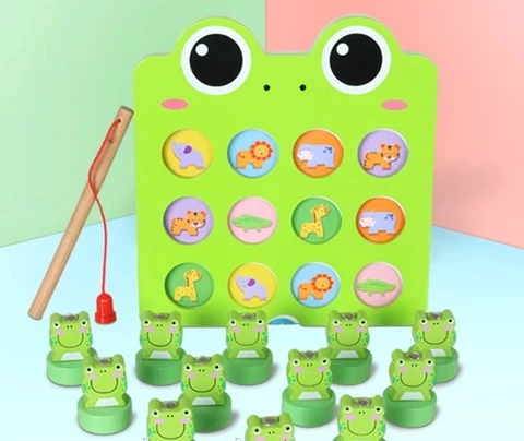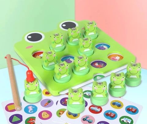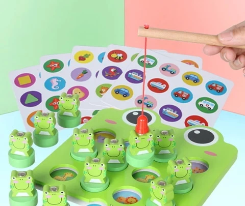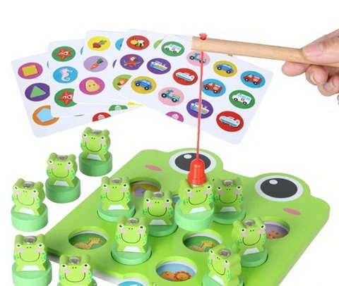 Цікава гра дуже подобається діткам, адже вона яскрава і креативна. З її допомогою відмінно тренується дрібна моторика, координація, пам'ять і уява. Необхідно вставляти картки із зображеннями в планшет, на отвори поставити жабенят і за допомогою магнітної вудки піднімати одного за одним. Потрібно зібрати однакові пари, також можна паралельно розповідати про те, що намальовано на картках. Гра дуже цікава і якісна, вона прекрасно підійде в якості подарунка.