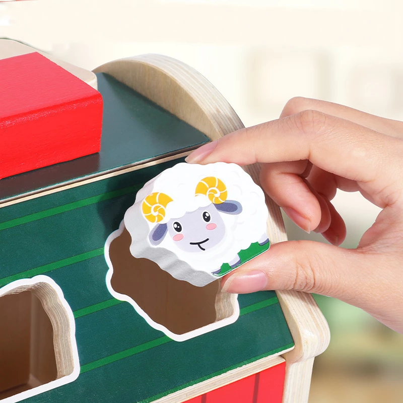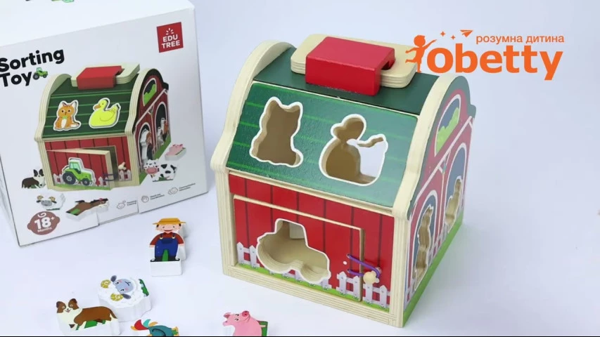 Цей дерев'яний фермерський будиночок — ідеальна іграшка для розвитку дрібної моторики і координації рук та очей. Фігурки тварин, фермера та трактора поміщаються в окремі вирізи у стінах та даху будиночка. Сортування фігур дозволяє дітям практикувати зіставлення та знайомитися з мешканцями ферми. Також гра розвиває творчі здібності: граючи фігурками сільськогосподарських тварин, маленькі фантазери зможуть придумати численні історії та оживити іграшкову ферму за допомогою своєї уяви.