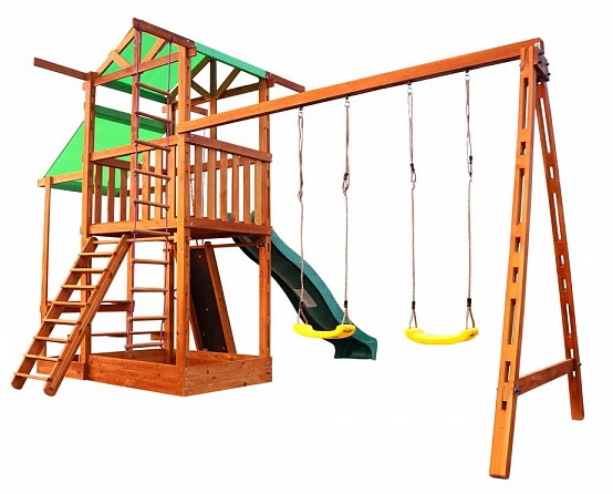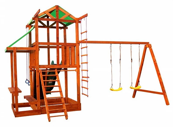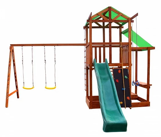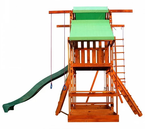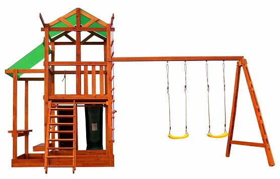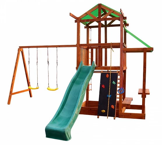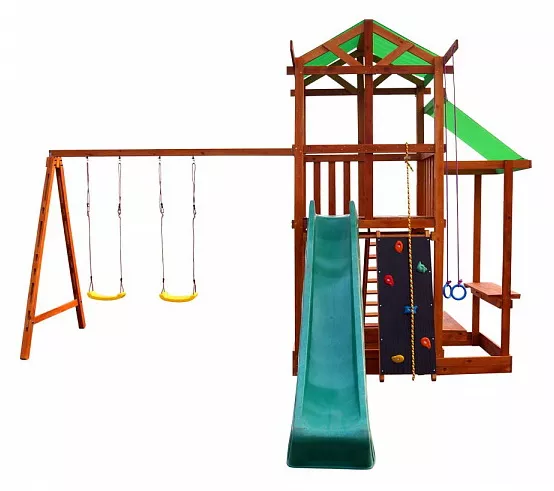 Чудовий дитячий ігровий комплекс складається з безлічі захоплюючих і цікавих функцій. Ваша дитина зможе лазити по підвісним сходам, канату, стінці для лазіння, котитися з гірки, забиратися на другий поверх, кататися на гойдалці. У цій моделі є зручний столик і лавка, які будуть зручні і дітям, і батькам. Сам комплекс досить об'ємного розміру, тому він підійде, як і для дитячого садка, так і для двору багатоквартирного будинку, дачі. Міцна і довговічна якість зможе радувати дітей з покоління в покоління, а різноманітність сходів і лазівок, позитивно вплине на фізичний розвиток дитини.