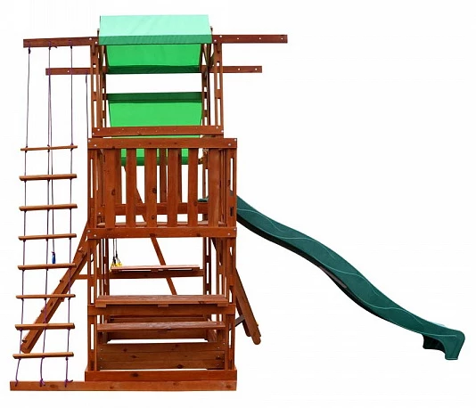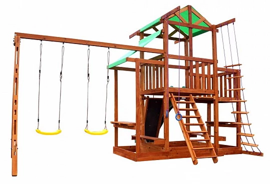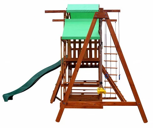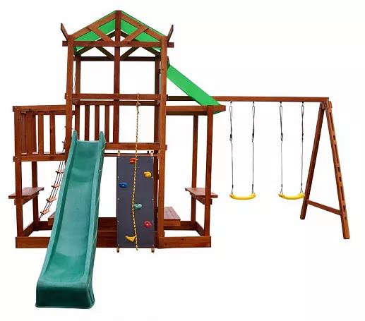 Чудовий багатофункціональний ігровий комплекс, який не залишить байдужим діток. Він стане улюбленим місцем для активних ігор і відпочинку малюка. Багатофункціональність даної моделі здивує. Крім безлічі лазівок і гойдалки, в ньому є зручні столики та лавки, так само є і місце для пісочниці. А ще є невеликий скалодром. Дитячий ігровий комплекс підійде для дачі і красиво виглядатиме в загальному дизайні двору. На другому поверсі даної конструкції є перегородка, що запобігає падінню, що робить цей ігровий комплекс досить безпечним для маленьких діток.