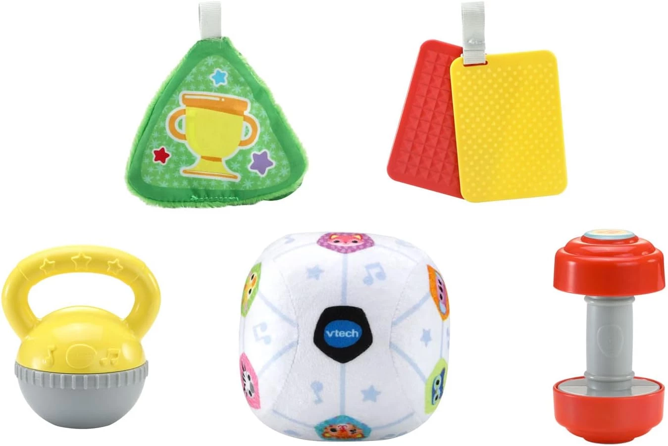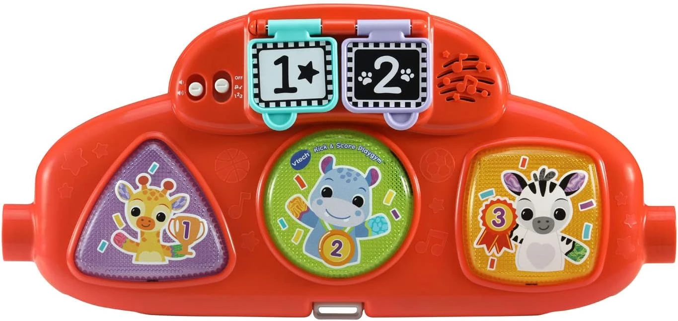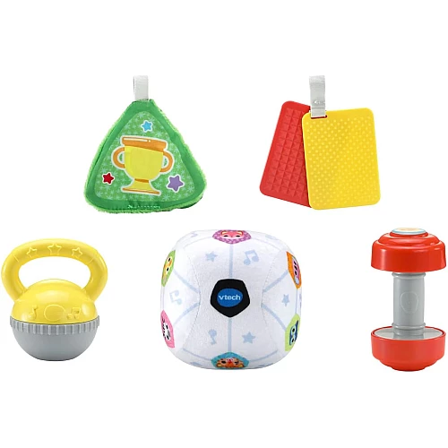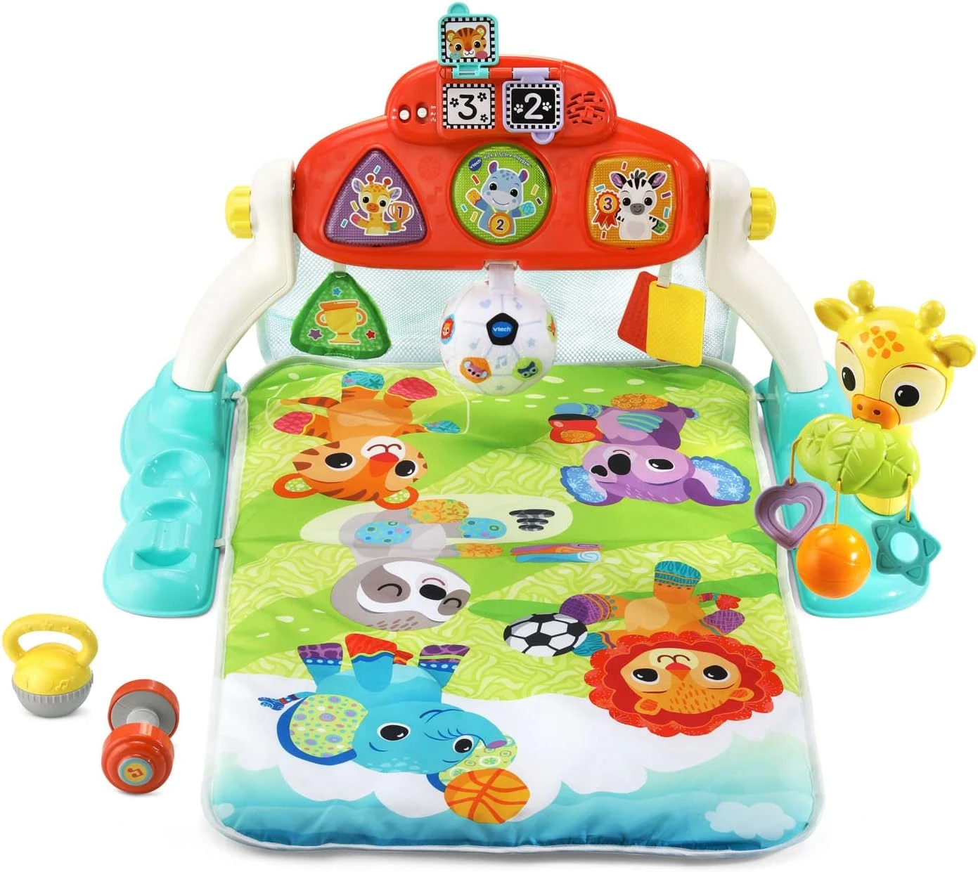 Килимок "Футбол" від торгової марки VTech передбачає 4 способи гри, що дозволяють малюкові тренувати свої маленькі м'язи в компанії милих звірят. Розвивайте моторику та сенсорне дослідження за допомогою п'яти знімних ігрових елементів, включаючи гантель, гирю, дві текстуровані картки, кубок, а також м'який футбольний м'ячик. Ігровий центр має низку зручних функціональних можливостей, які зможуть гідно оцінити батьки: регулювання гучності для тихішої гри, міцна конструкція та автоматичне відключення. Килимок можна прати у машині.