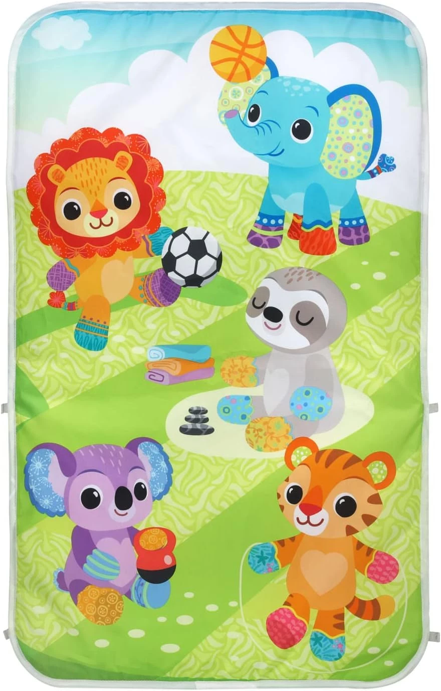 Зміцнюйте м'язи корпусу під час гри на животі і на підлозі на м'якому і яскравому ігровому килимку, який легко миється. Крутіть і клацайте гирю, гриміть гантеллю, вивчайте кольорові картки та багато іншого.