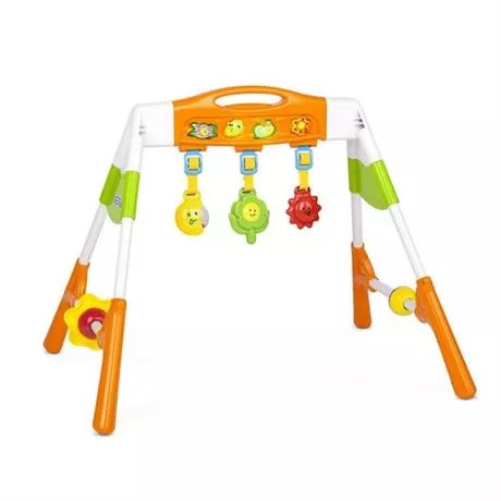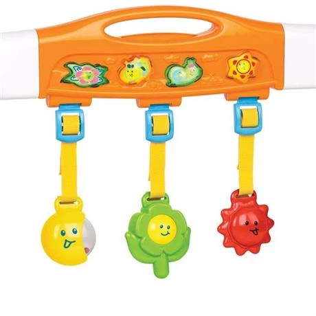 Захоплюючий і корисний ігровий центр сподобається малюку і захопить його. На центрі висять 3 іграшки різних кольорів. Це спонукає дитину тягнутися, намагатися дістати їх і розглянути. Ще є 4 кнопки у вигляді кумедних істот. Натискаючи на кнопочки, дитина включає приємні мелодії і світлові ефекти. Розвиває слух і зір малюка. Іграшки знімні і малюк може грати трьома брязкальцями-прорізувачами для зубів окремо від центру. Для перенесення ігрового центру є зручна ручка.