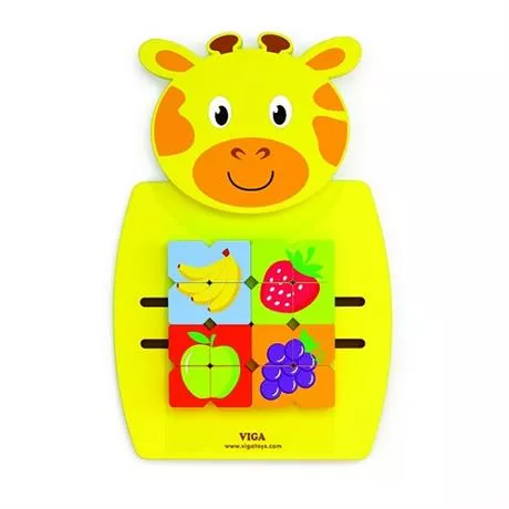 Яскравий бізіборд жираф з пазлами фруктами пропонує дитині зібрати 4 кольорових пазла з фруктами. Бізіборд можна повісити на стіну, для зручності збору пазлів.