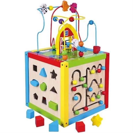 Дерев'яний бізікуб 5-в-1, в якому діти знайдуть дротяний лабіринт з фігурками, годинник, сортер, дошку для малювання, дерев'яний лабіринт. Для зручності зберігання, дротяний лабіринт можна сховати всередину бізікубіка. Іграшка з дерева, абсолютно безпечна для дітей.