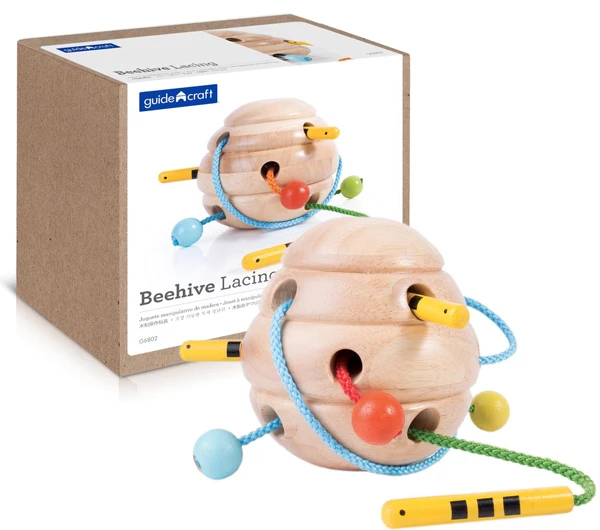 Класична пірамідка в оновленому дизайні — з основою у формі черепахи. Допомагає дитині вивчати розміри, кольори, розвиває дрібну моторику, логіку та концентрацію. М’які кільця легко одягаються і не травмують ручки малюка. - Тактильний набір шнурівка Вулик (4 шт) від Guidecraft.