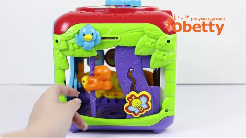 Цей яскравий бізікубік - п'ять граней веселощів! Вашій дитині сподобається досліджувати сім захоплюючих головоломок і дві електронні панелі, на яких представлені кольори, цифри, тварини та багато іншого. Перевертайте сторінки книжки і слухайте дві дитячі пісеньки, повертайте форми і рухайте фігурки тварин, щоб розвинути дрібну моторику. Інтерактивний куб включає в себе більше 75 пісень, мелодій, звуків і фраз. В кубика є форми для сортування кольорових блоків. Є 5 клавіш із зображенням цифр і тварин.