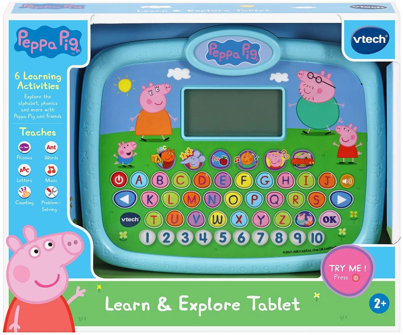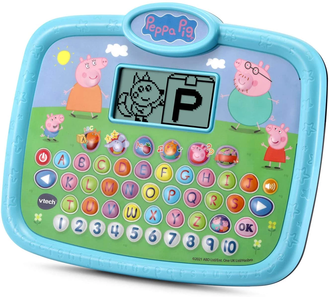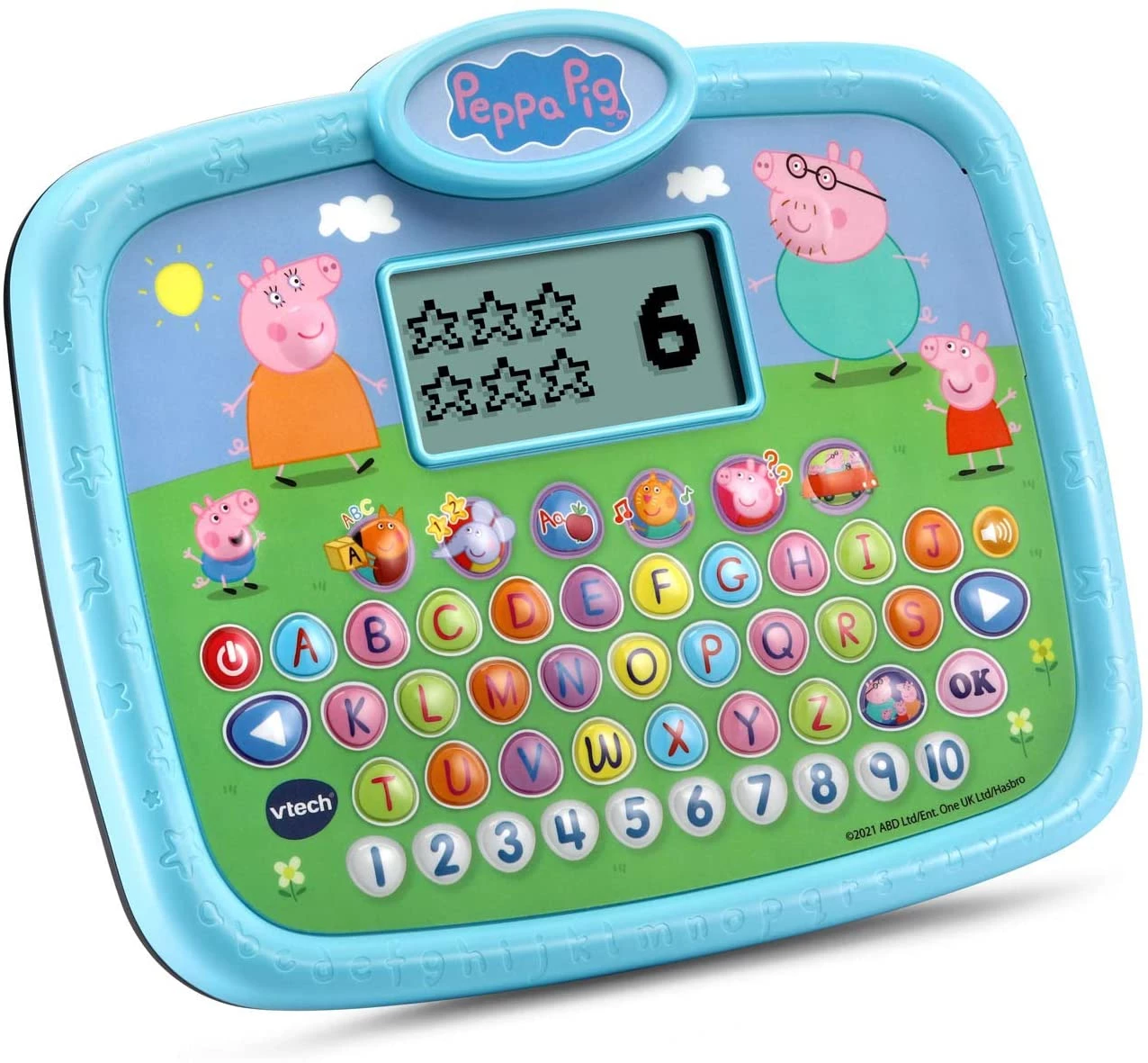 Цікавий планшет в стилі популярного мультика "Свинка Пеппа" призначений для розвиваючих ігор на англійській мові. Можна легко запам'ятати алфавіт і розібратися в базових математичних операціях. Шість інтерактивних завдань навчають письму, фонетиці, рахунку, навичкам вирішення проблем, музиці і словами. Вивчіть 26-буквену клавіатуру і десять цифр. Чотири сенсорні кнопки персонажів відтворюють улюблені висловлювання персонажів їх голосами.