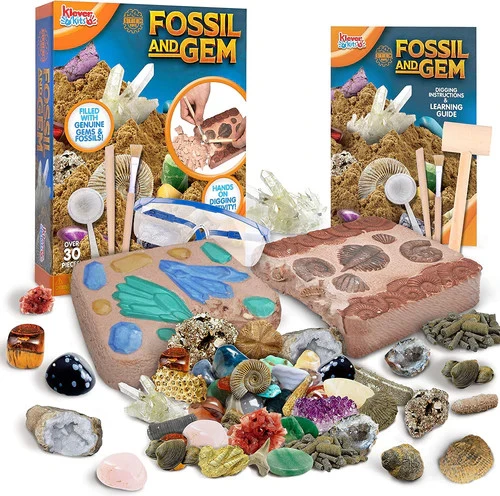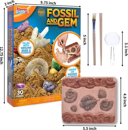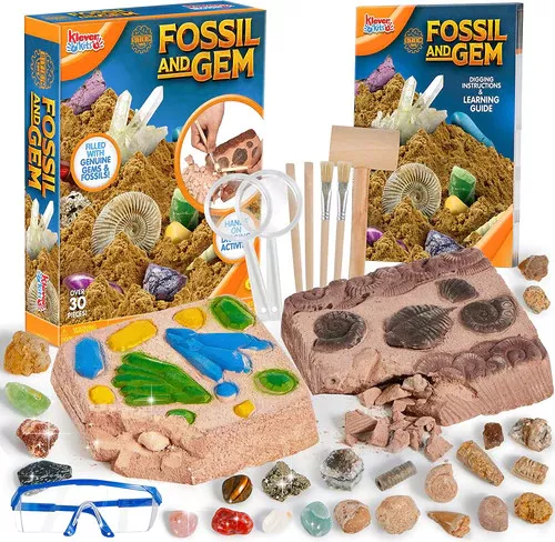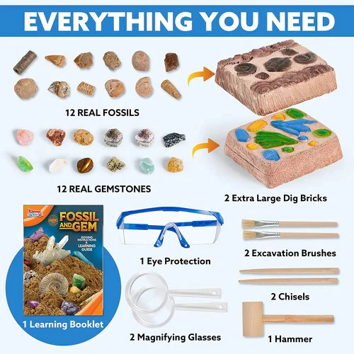 Цей набір від торгової марки Joyin стане цінним подарунком для допитливих непосид і фантазерів у віці від чотирьох років. Комплект для розкопок дорогоцінного каміння і скам'янілостей 2 в 1 включає 2 долота, 2 щітки, 2 збільшувальних скла, 2 брикети зі скам'янілістю, у тому числі 12 дорогоцінних каменів, 12 скам'янілостей, а також навчальний буклет.
