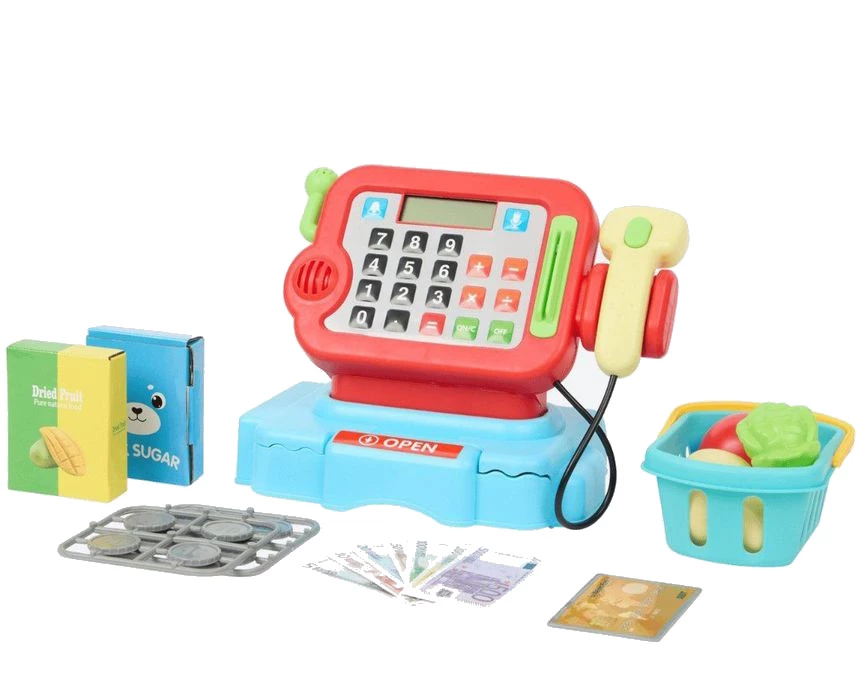 Цей іграшковий касовий апарат – чудовий подарунок вашій дитині. Яскравий ігровий набір містить все необхідне для захопливої гри у супермаркет. У комплект входить каса, іграшкові гроші, банківська картка, кошик та всілякі продукти. Іграшка оснащена звуковими та світловими ефектами, а також справжнім калькулятором. Купюри зберігаються у висувній скриньці.