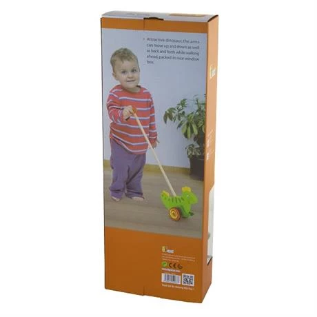 Веселий зелений динозаврик при русі махає лапками, закликаючи малюка йти вперед. У каталки є довга зручна ручка з наконечником кулькою. Він зручно поміщається в дитячій ручці і служить опорою для дитини під час ходьби або бігу.