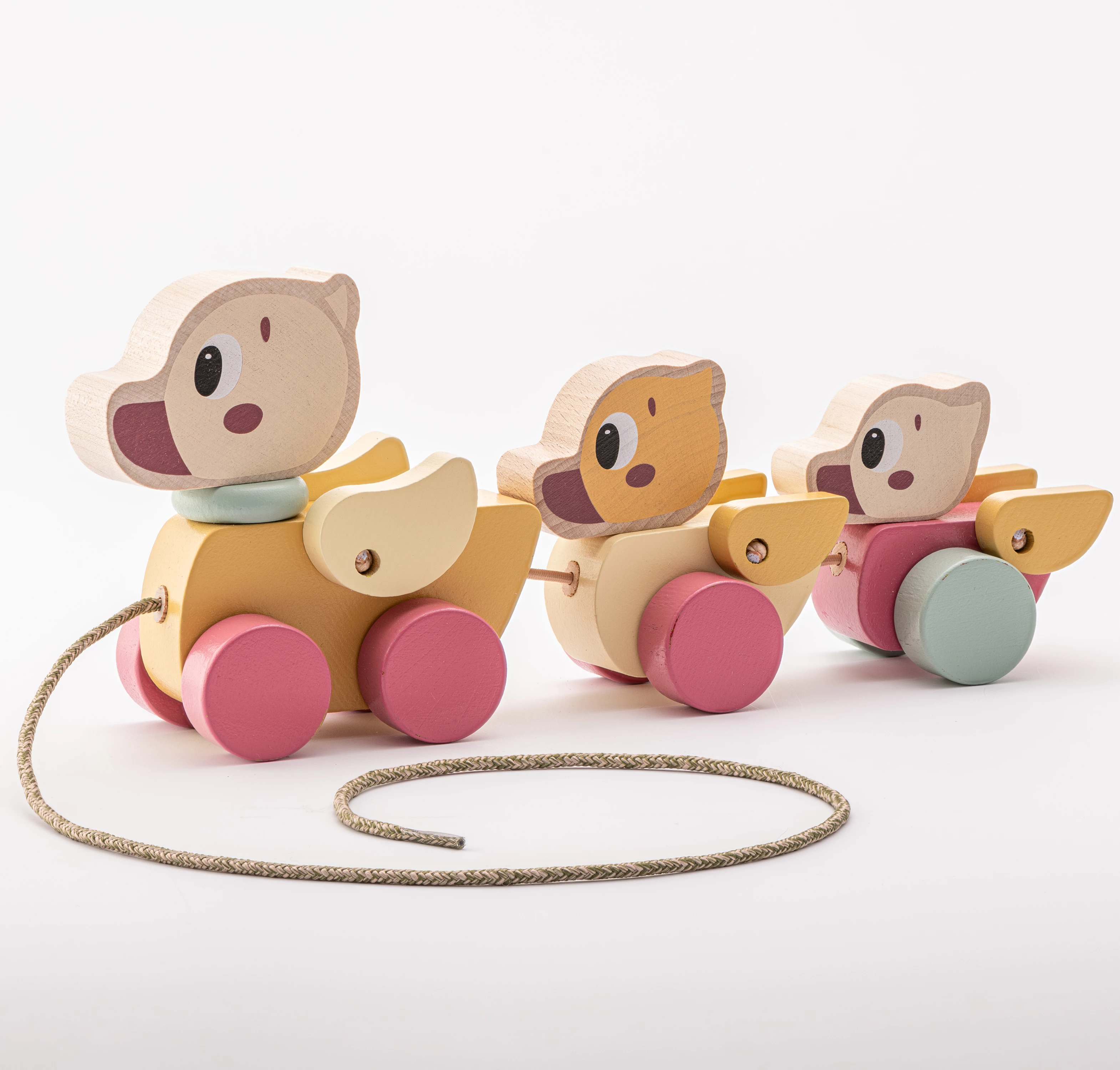 Це дружне сімейство з трьох каченят на рожевих і м'ятних коліщатках стане вірним супутником вашого малюка в його перших домашніх пригодах. Іграшка створена з натурального карпатського дерева, яке так приємно та тепло відчувати у маленьких долоньках. Малюкові буде неймовірно цікаво вести за собою цей слухняний паровозик, спостерігаючи, як каченята весело йдуть за ним на мотузку. Лаконічний та стильний дизайн у дусі мінімалізму робить каталку не лише ідеальним подарунком, а й естетичною прикрасою будь-якої дитячої кімнати.