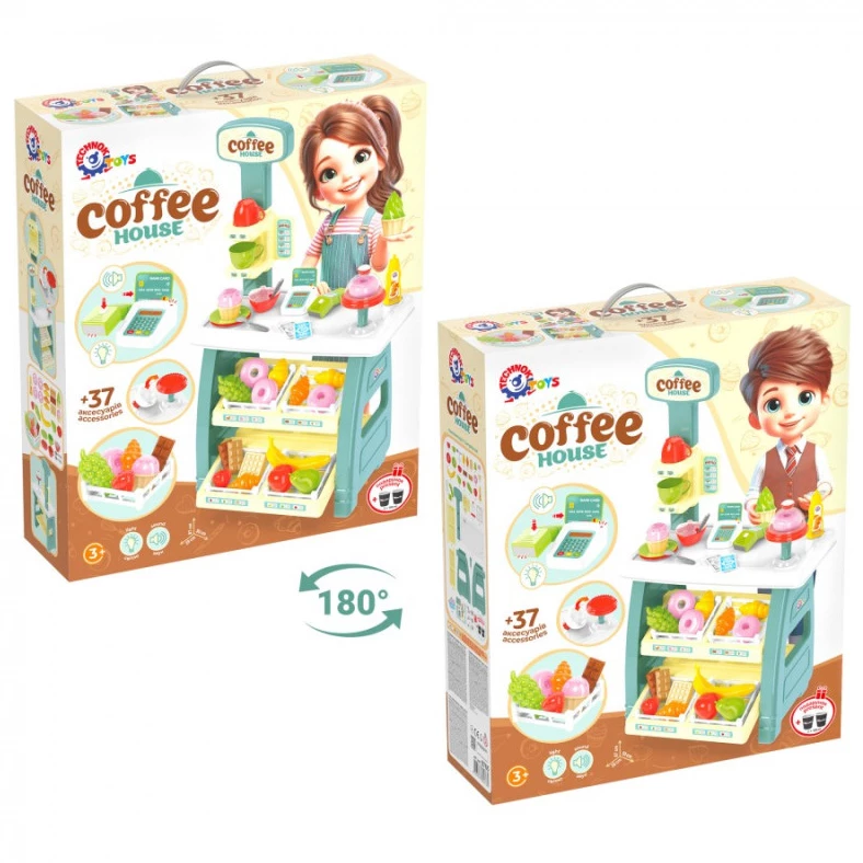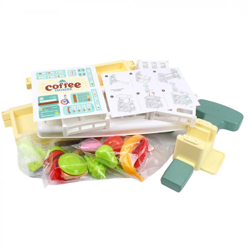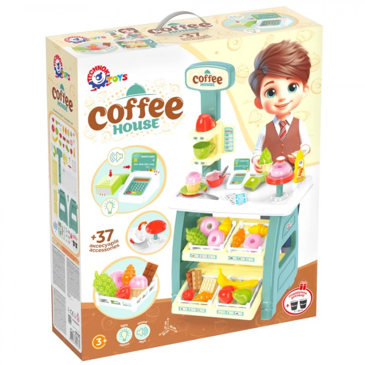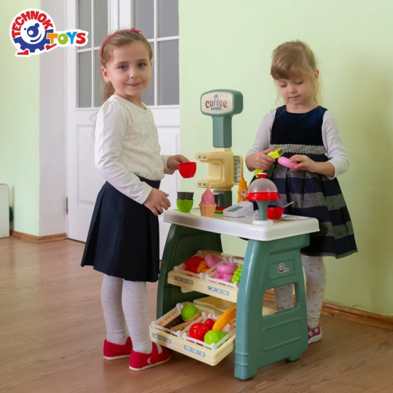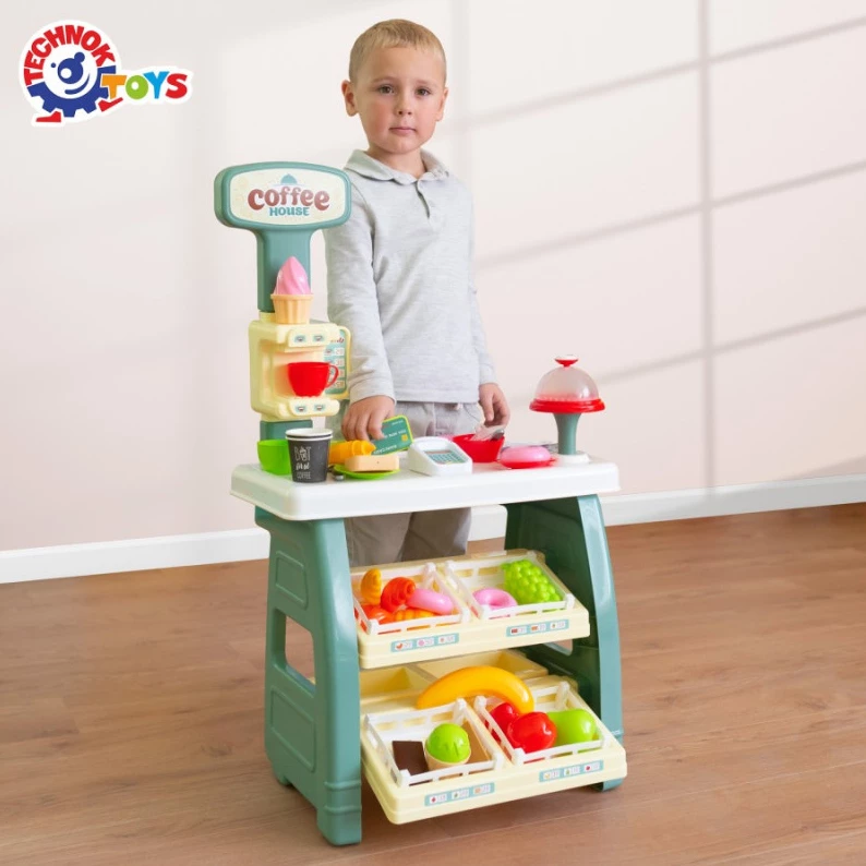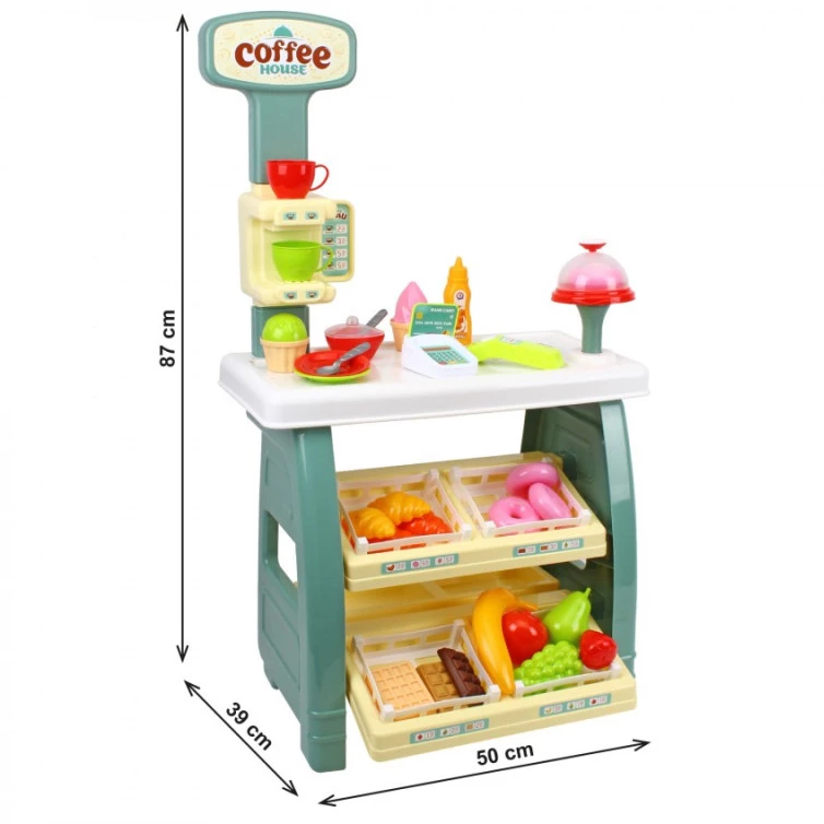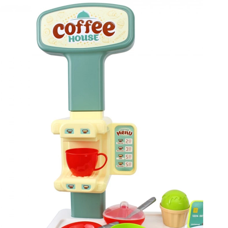 Набір включає все необхідне для реалістичної гри: велику стійку з кавоваркою, вивіску з меню, стильний посуд, а також просторі полиці і красиві скриньки для демонстрації випічки і фруктів. Іграшкова кав'ярня стимулює уяву, соціальні навички та вміння працювати в команді, дозволяючи дітям приміряти на себе ролі бариста, касира, покупця та власника. Це гарантує веселе та пізнавальне проведення часу відразу для декількох дітей.