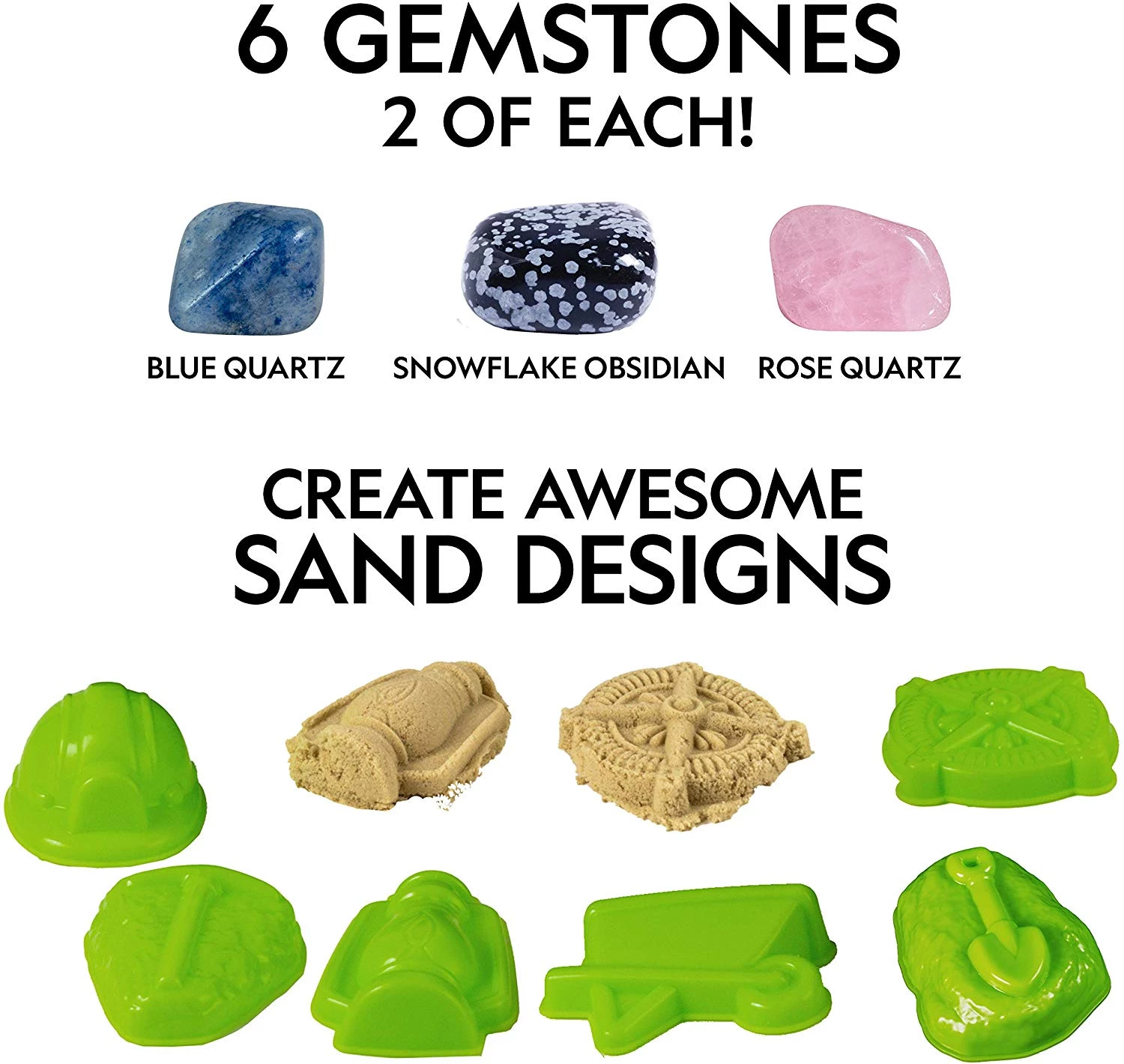 У наборі 6 справжніх каменів, закопаних в піску. Ці дорогоцінні камені включають: 2 снігових обсидіана, 2 рожевих кварца і 2 зразка синього кварцу.