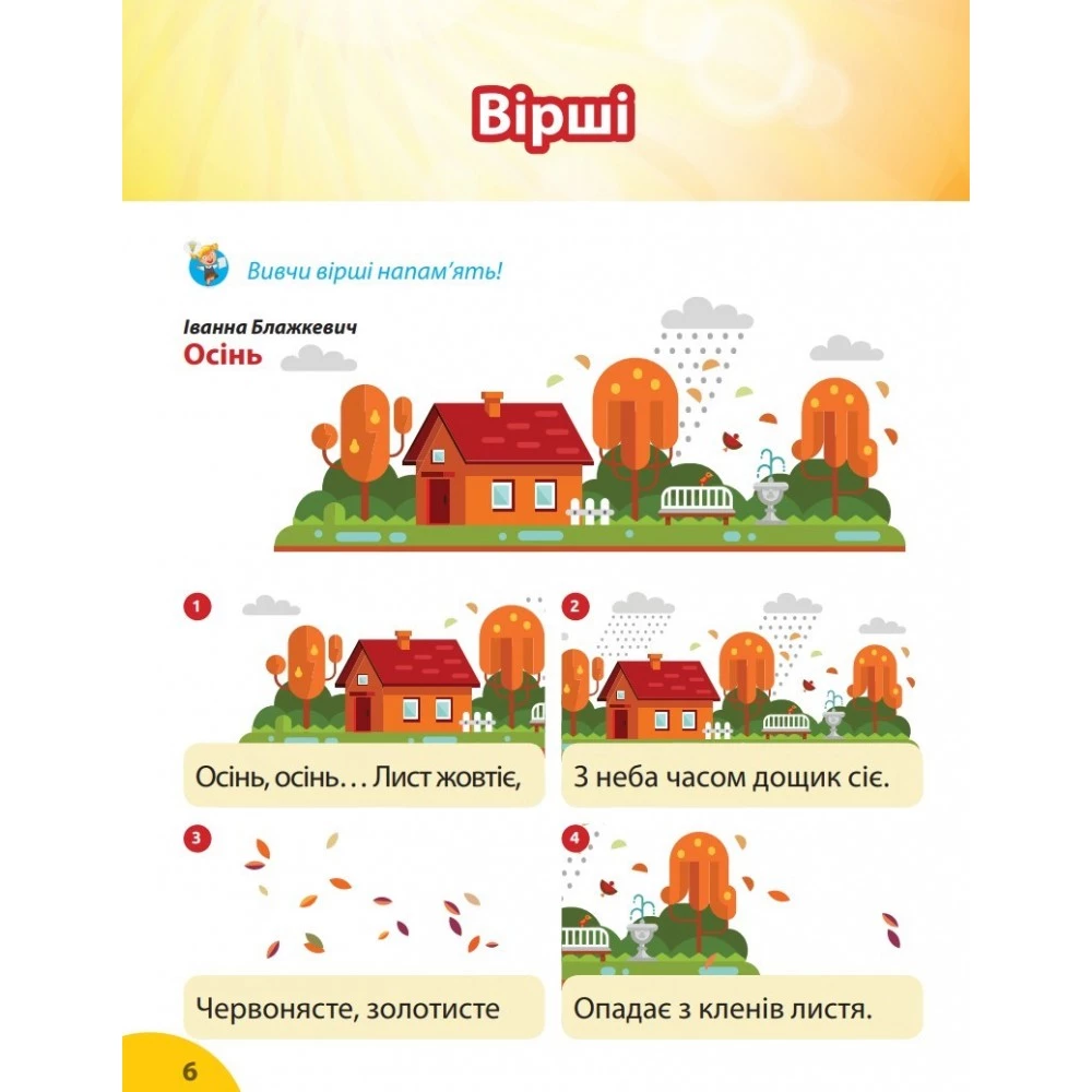 - вірші вивчаються напам'ять, представлені способом наочного моделювання на початку для зручності швидкого пошуку.