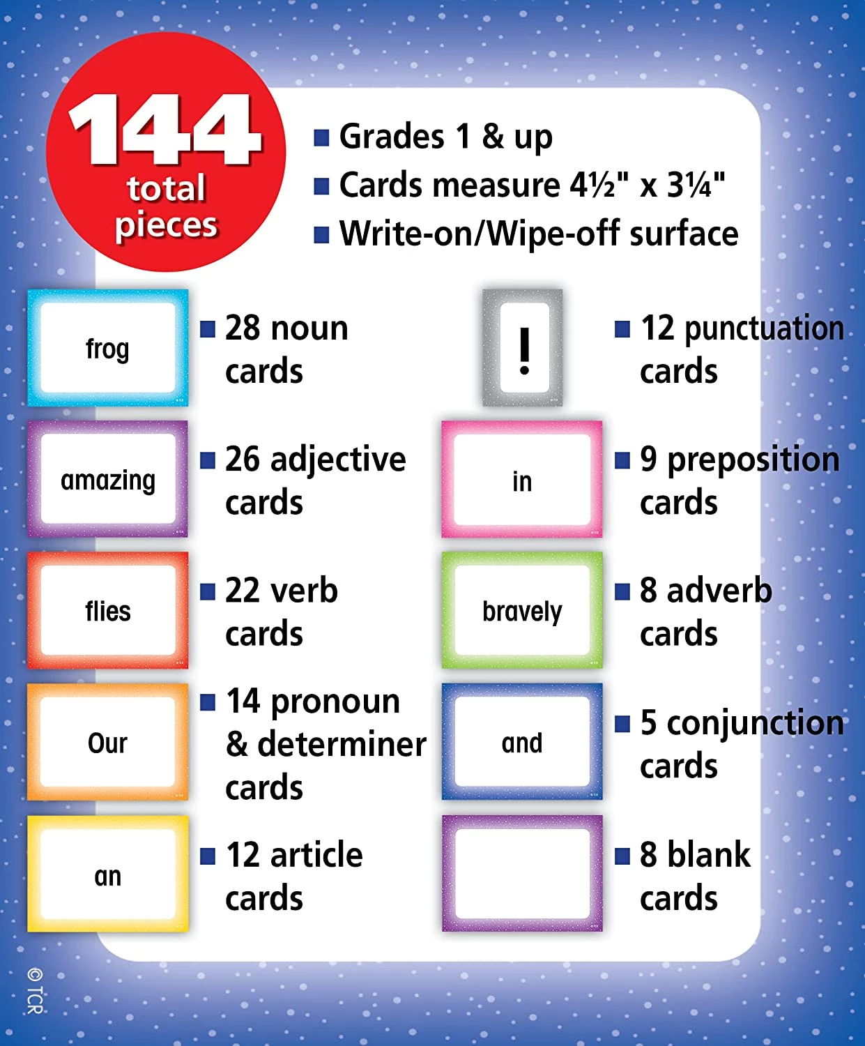 Представлений набір включає 28 карток з іменниками, 26 карток із прикметниками, 22 картки із дієсловами, 14 карток із займенниками, 12 карток з артиклями, 12 карток з пунктуацією, 9 карток з прийменниками, 8 карток з прислівниками, 5 карток зі сполучниками, а також 8 порожніх карток. За допомогою цього навчального набору дитина попрактикується у складанні простих речень та зміцнить свої знання англійської мови. Поверхня карток ламінована і підходить для створення записів маркером, що стирається.