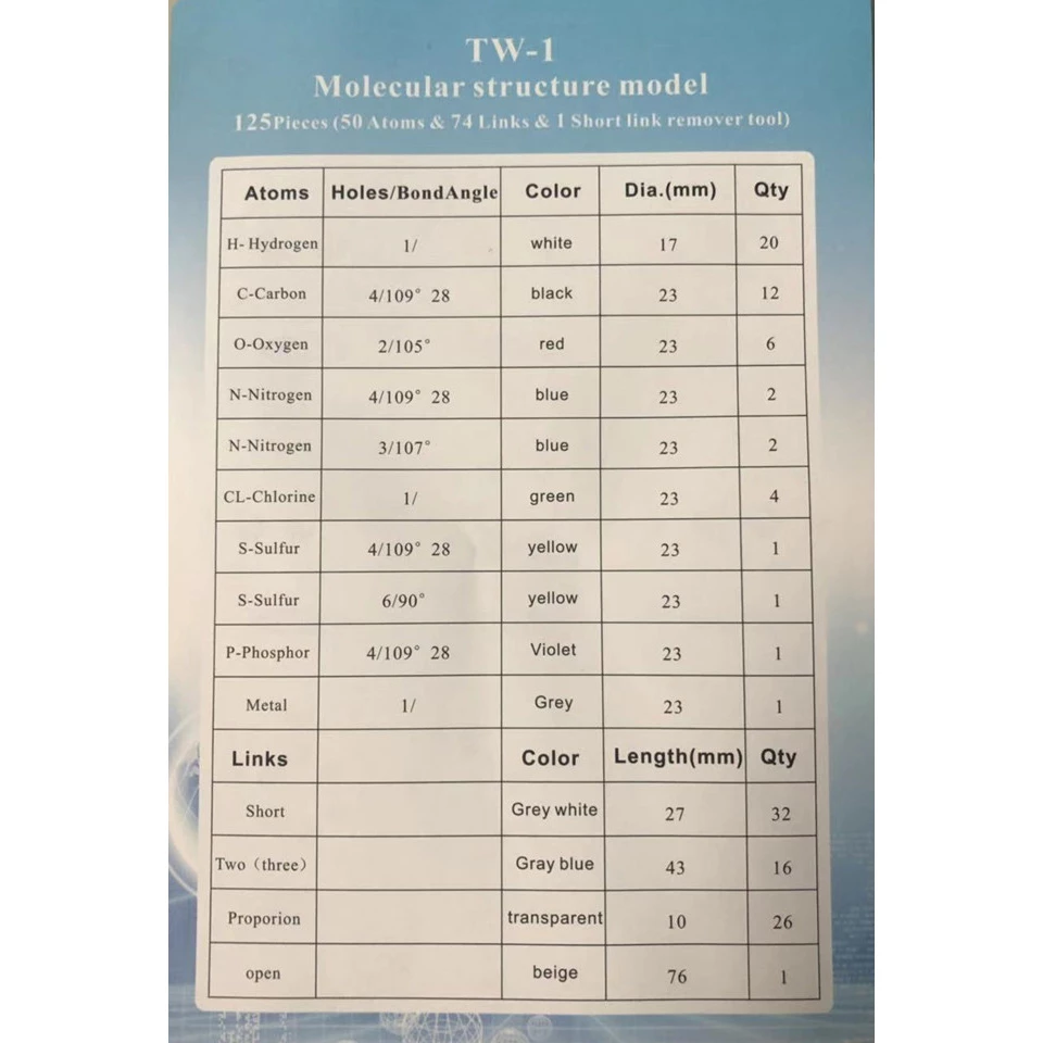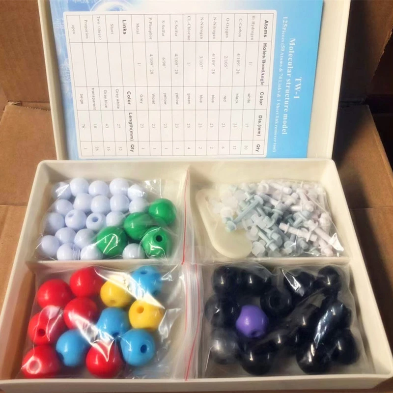 Ці деталі набору молекулярних моделей мають колірне кодування відповідно до національних стандартів для полегшення ідентифікації. Деталі поставляються в пластиковій коробці для зручного зберігання. Допоможе вчителям і батькам розвивати інтерес дітей до хімії.