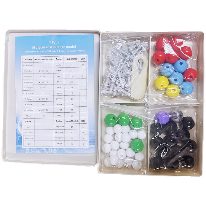 Ідеальний набір хімічних моделей для моделювання простих, малих та складних хімічних структур. Цей набір молекулярних моделей містить 122 елементи, включаючи інструмент для зняття ланок. Надзвичайно прості в побудові моделі для органічної та неорганічної хімії. Ця модель містить C, H, O, N, S та різноманітні одинарні та подвійні зв’язки, може бути використана в середній школі, університеті.