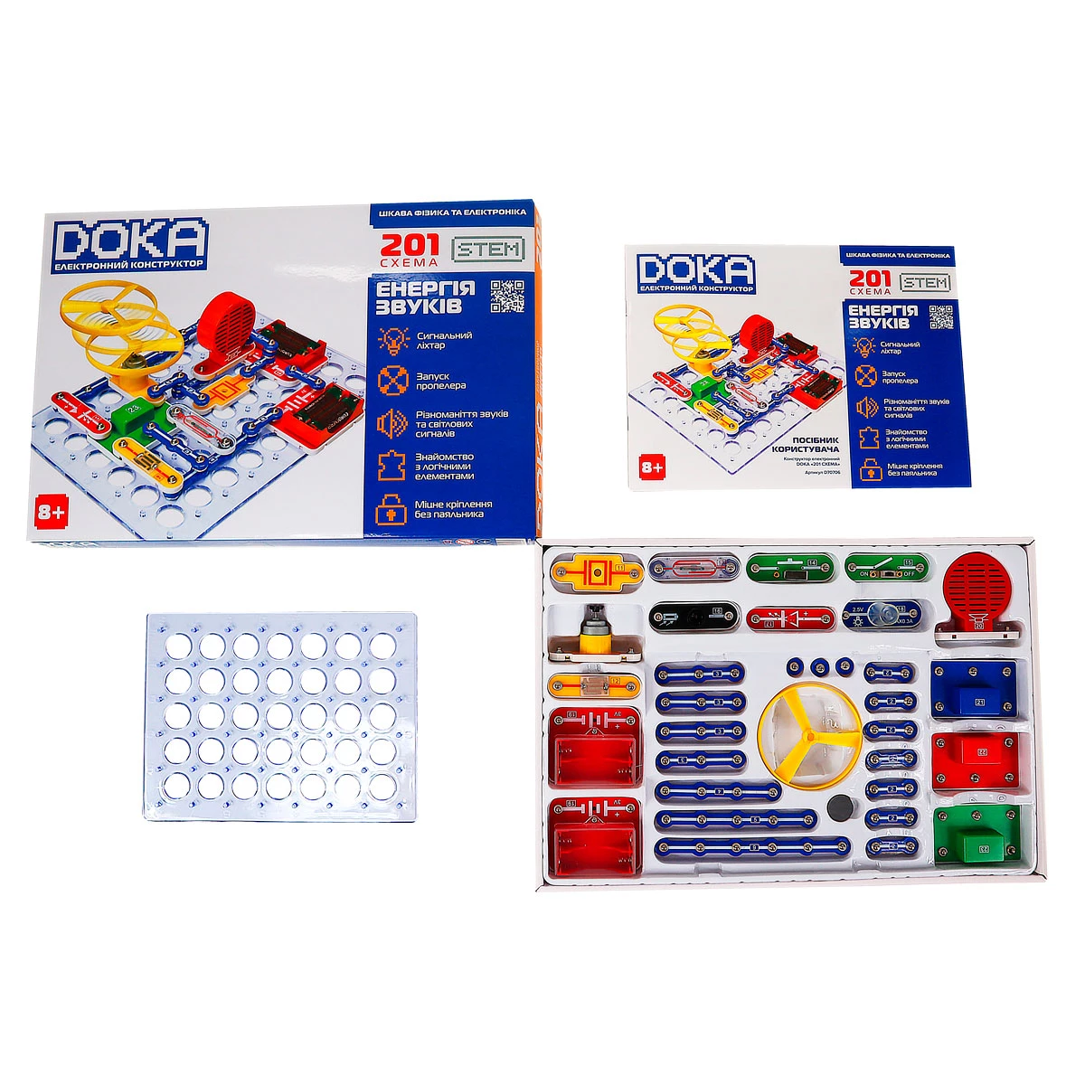 Набір також укомплектований інструкцією, за допомогою якої дитина зможе зібрати 201 електричну схему. Електронний конструктор дозволяє на практиці освоїти ази керування світлом, звуком, електрикою та водою.
