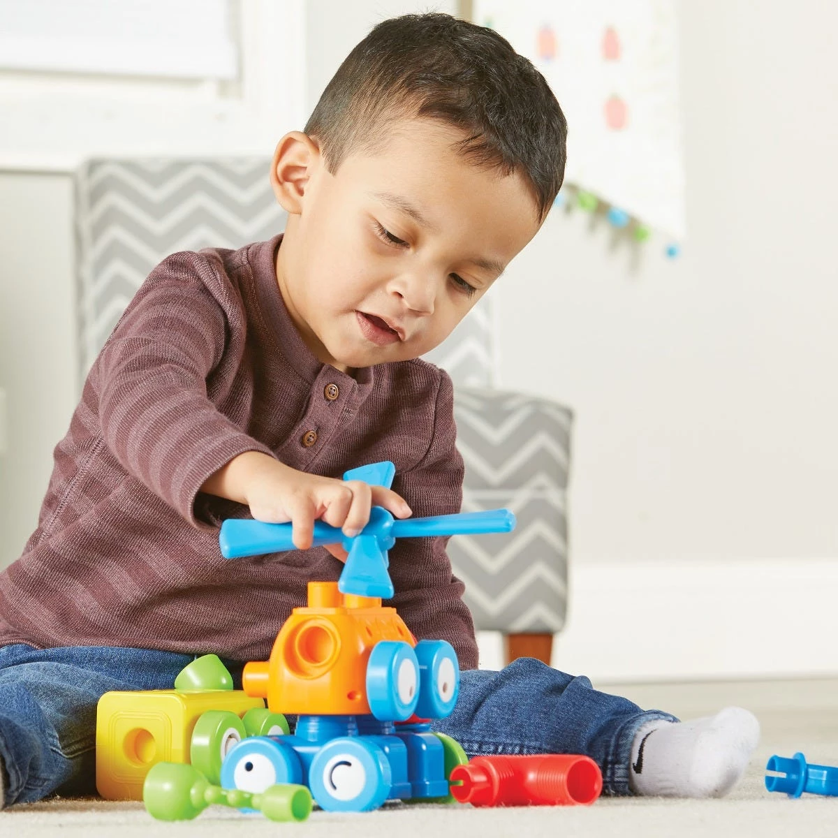 Справжня фабрика роботів в одній коробці. Діти створюють своїх власних крутих роботів за допомогою комбінованих частин 1-2-3 Build It! Фабрика роботів. Масивні пластмасові деталі за розміром якраз ідеально підходять для маленьких ручок. Будуйте високих роботів з хвилястими зеленими ногами, додайте кілька очей, щоб ваш робот міг бачити, чи включите пропелер, що обертається! У наборі є буклет з докладними рекомендованими збірками, які допоможуть дітям оволодіти необхідними STEM-навичками, від критичного мислення та раннього проектування до проходження вказівкам!