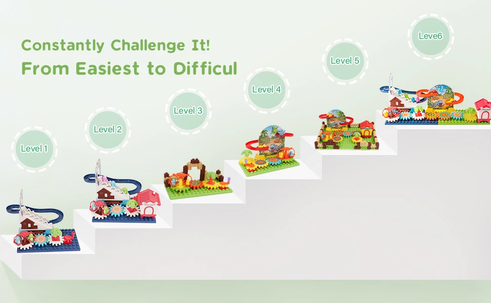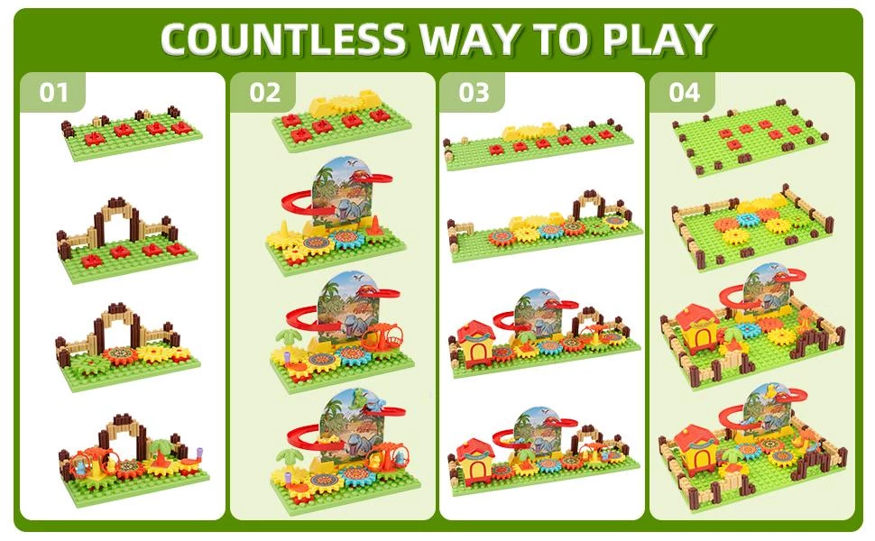 У комплект набору будівельних блоків входить милий мультяшний динозавр, рослина, гірка і другіелементи.