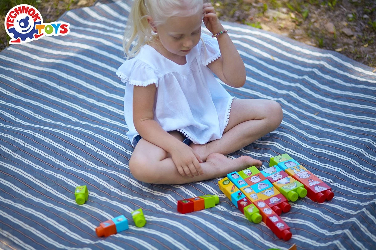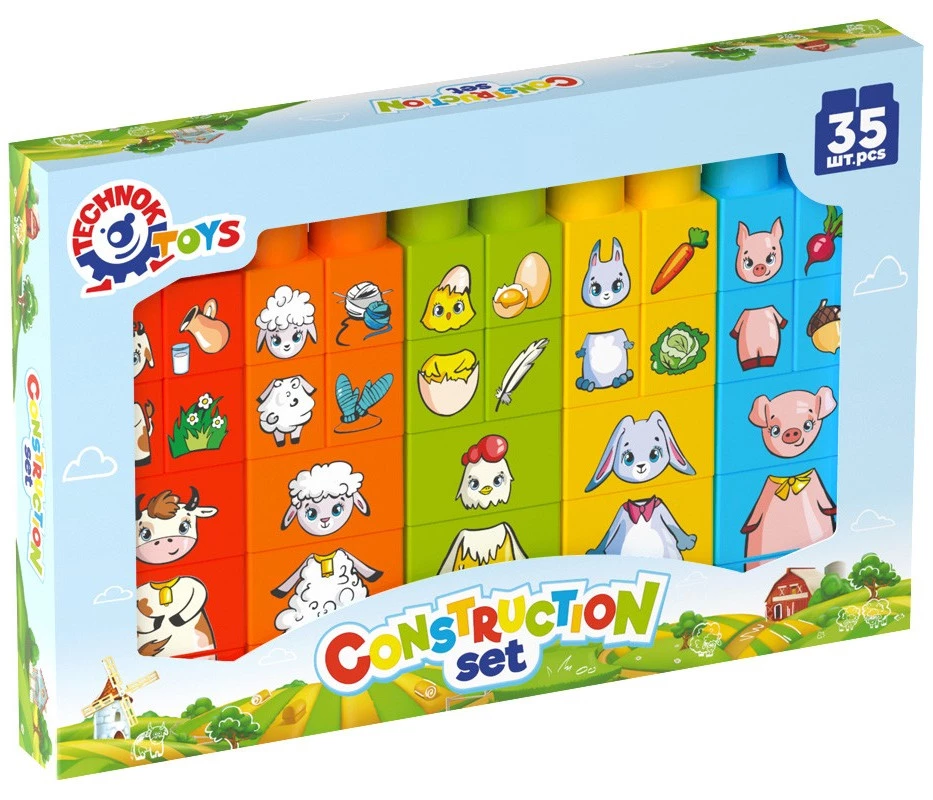 Представляємо вашій увазі конструктор, який допоможе малюкам вивчити назви свійських тварин, їх дитинчат, улюблених страв та сфер застосування. Всі персонажі нанесені на будівельні блоки різних кольорів, що допоможе дитині швидко знайти відповідну картинку. Завдання дитини — зібрати з трьох великих блоків фігурки тварин: 1 блок — голова, 2 блок — тулуб, 3 блок — ніжки. А з кубиків менших розмірів необхідно підібрати їх малюків та їжу.