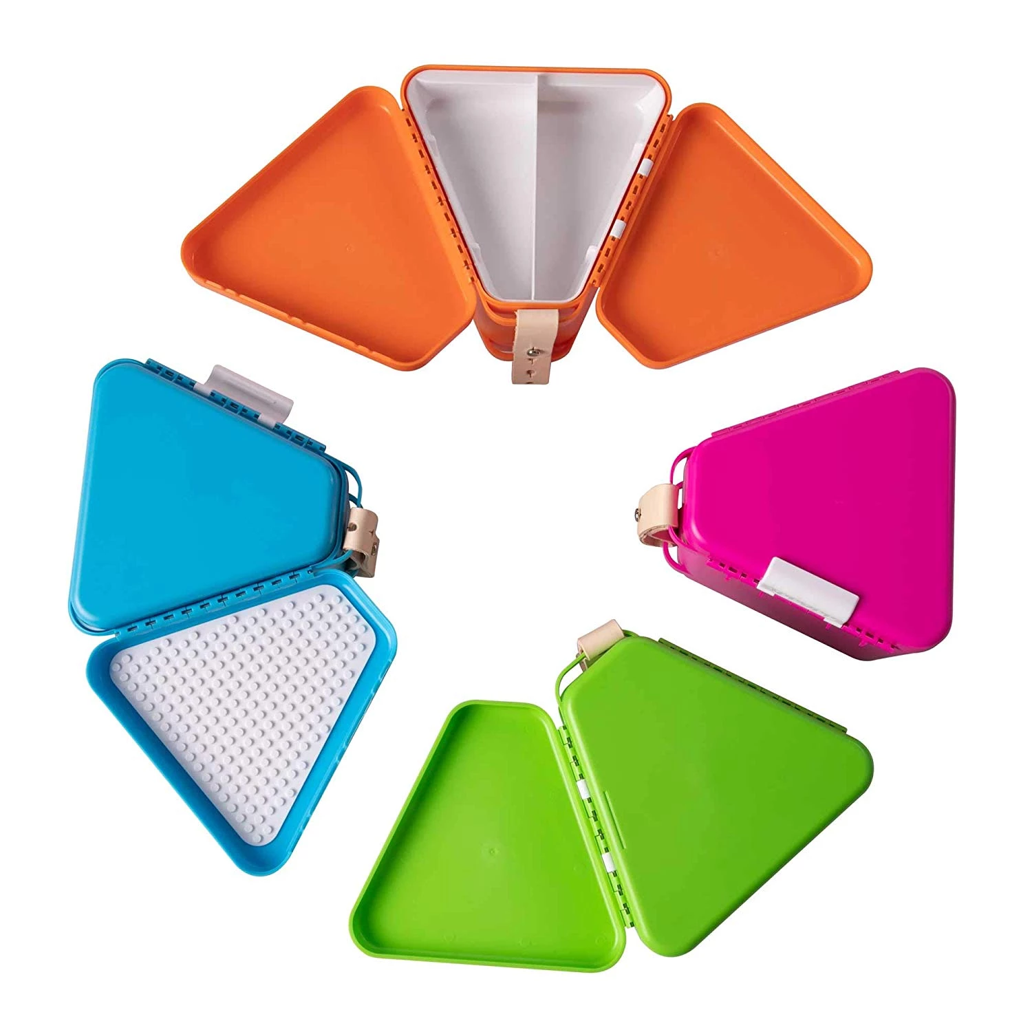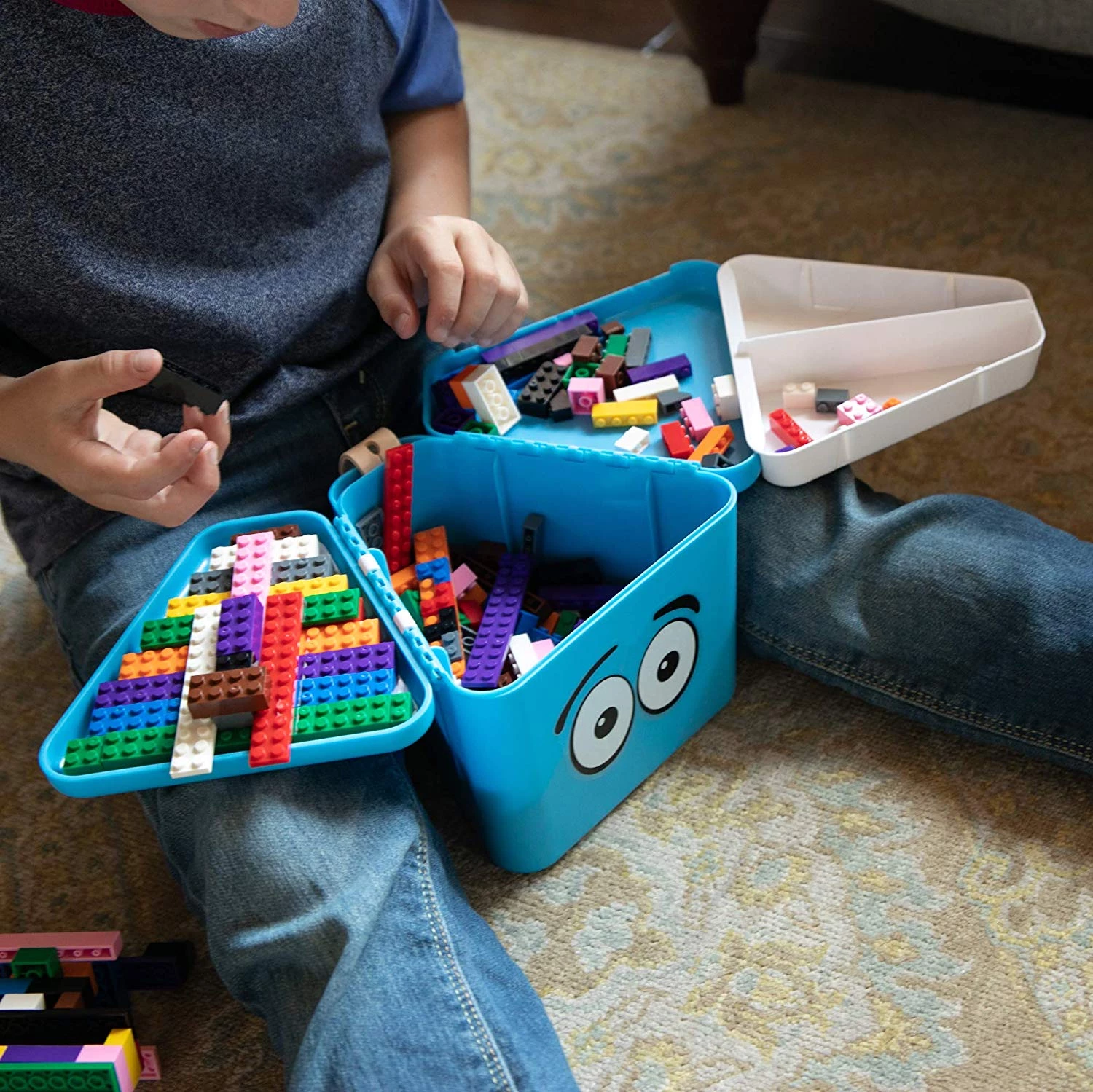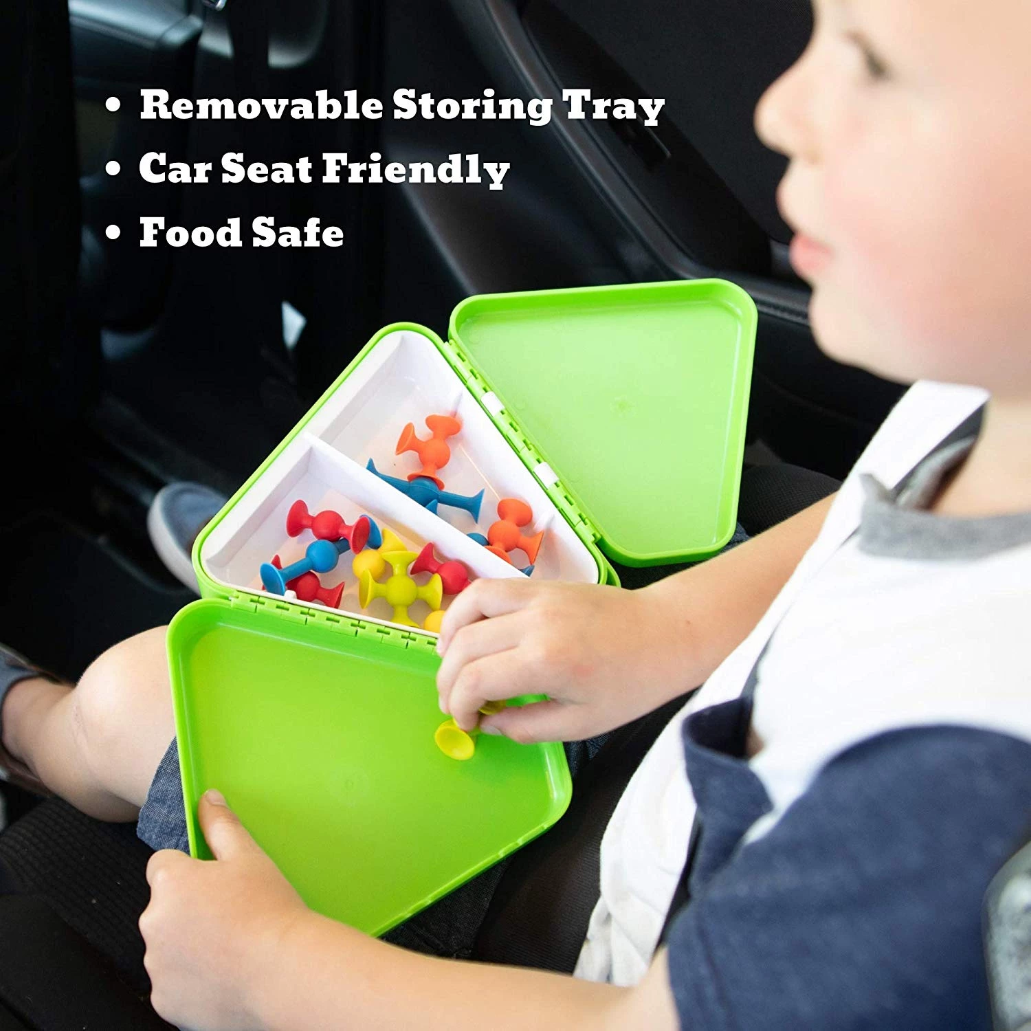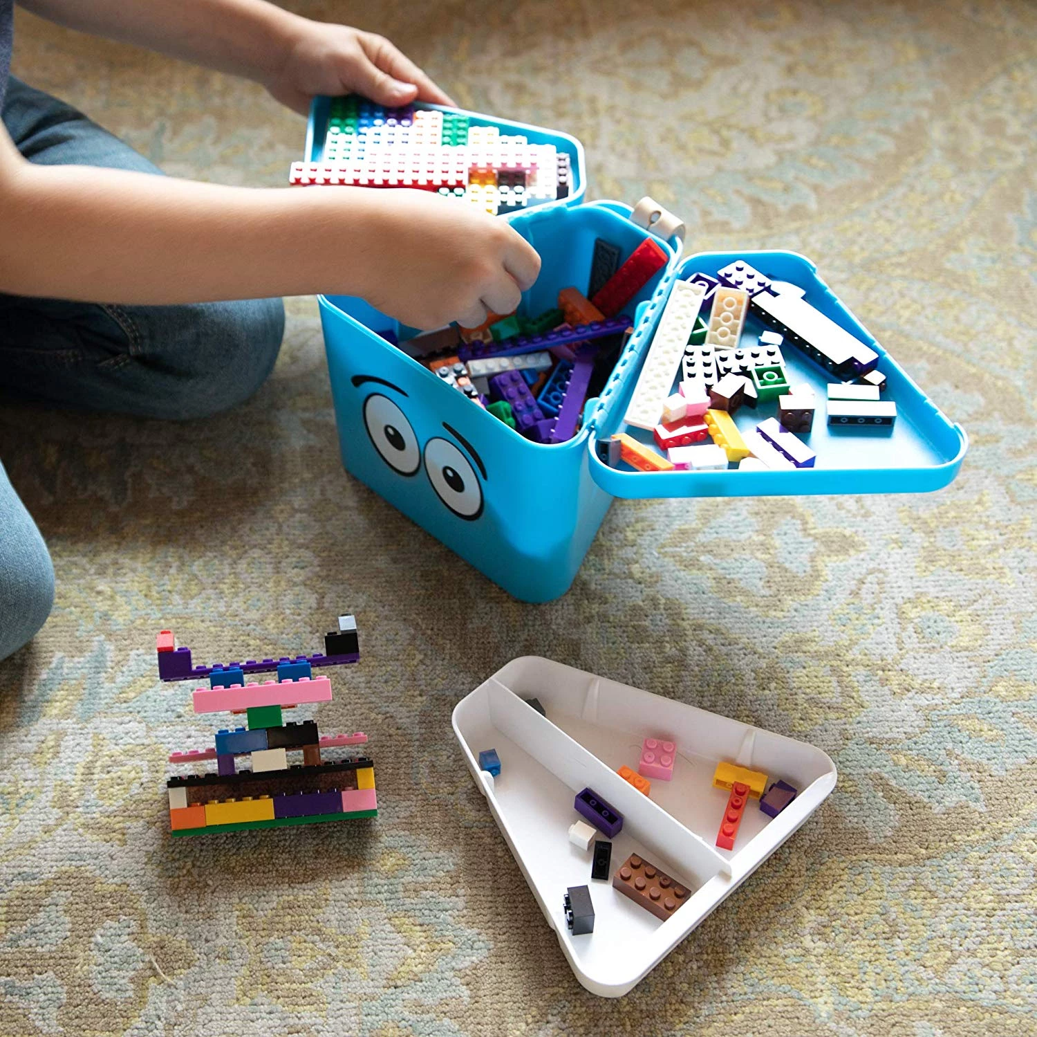 Зручна і містка трикутна коробка для іграшок, яку зручно носити з собою. У ній є 2 відкидні кришки, які розкриваються, створюючи простір для гри. Після розкриття, кришки зручно лягають на кожну ногу, а піднос для гри можна встановити посередині на саму коробку. Таку коробку зручно брати в подорожі або на прогулянки в парк.