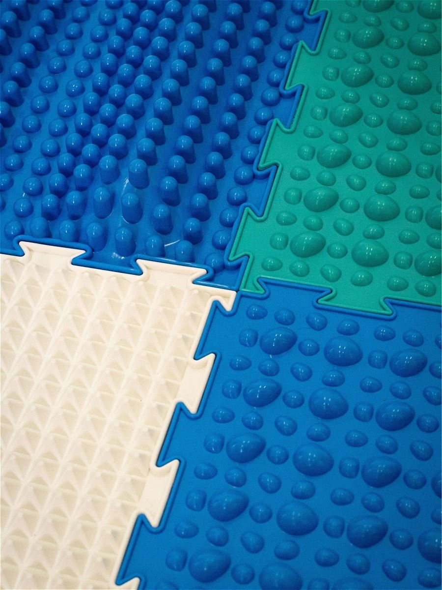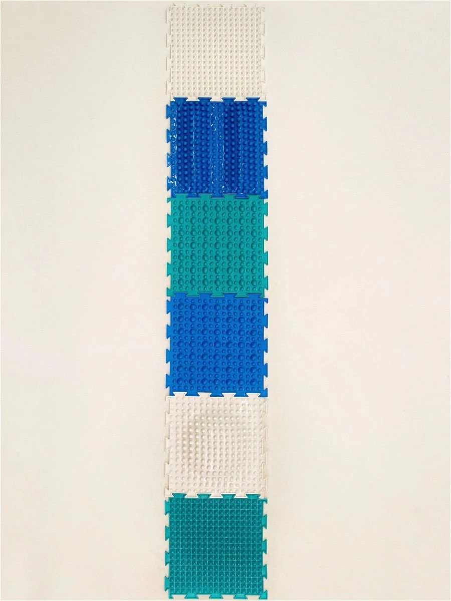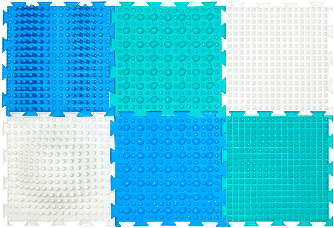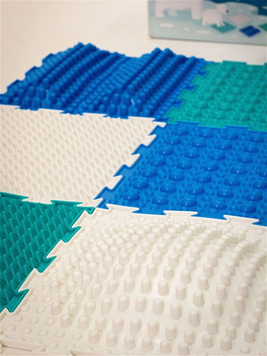 Ортопедичний килимок призначений для профілактики і усунення багатьох проблем з голеностопом, допомагає поліпшити координацію і розвинути тактильне сприйняття. Шість елементів легко з'єднуються між собою і мають різні рельєфні поверхні для опрацювання всієї стопи. Заняття рекомендується проводити в ігровій формі, щоб дитині було цікаво. Є спеціальна брошура з описом багатьох вправ. Виріб яскравий і виконаний в приємних синьо-зелених відтінках.