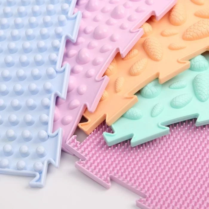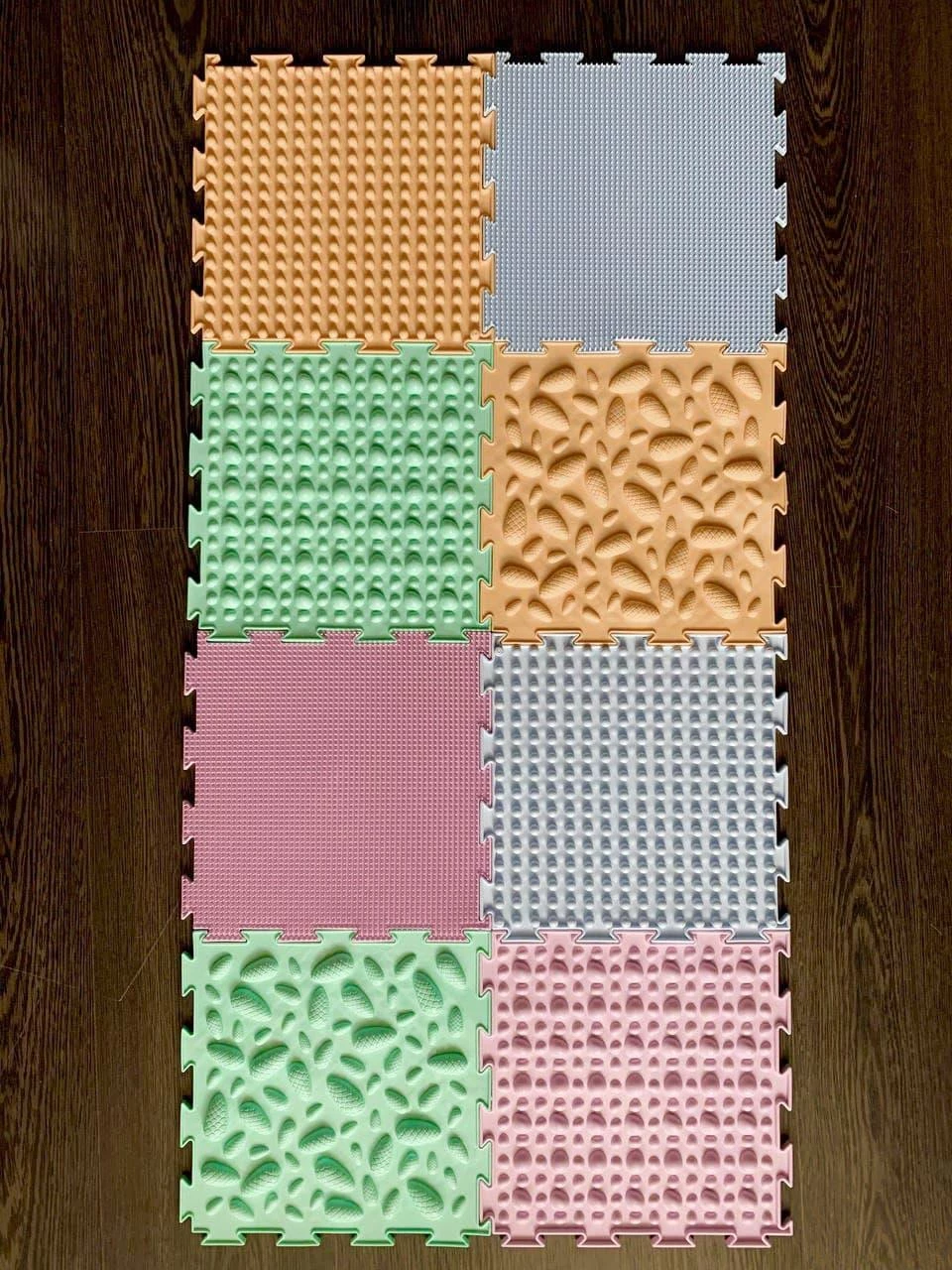 За допомогою даного килимка можна розвинути у дитини інтерес до фізичних вправ. Дозволяє добре потренувати координацію, урізноманітнити тактильні відчуття і поліпшити розумові здібності за рахунок масажу стоп. Також допомагає підвищити працездатність і зняти стрес. Всього в комплекті 8 квадратів з різними рельєфними поверхнями. Дуже добре підходить в якості профілактичного і терапевтичного спорядження.