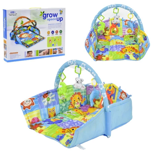 З цим килимком, ваш малюк знаходиться в безпечних і комфортних умовах і при цьому розвивається, граючи. Килимок обладнаний всім необхідним для дитини: його бортики прикрашені дрібними ілюстраціями, зверху підвішені м'які іграшки, які він зможе вивчати, а на передній м'якій стінці встановлено маленьке дзеркало, щоб дитина розглядала себе.