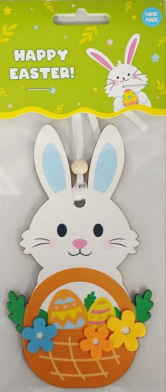 Чарівна підвіска у вигляді білого зайчика стане ніжним акцентом у вашому святковому інтер'єрі. Фігурка виконана з якісної деревини та доповнена яскравими деталями: плетеним кошиком, розписними яйцями та весняними квітами.