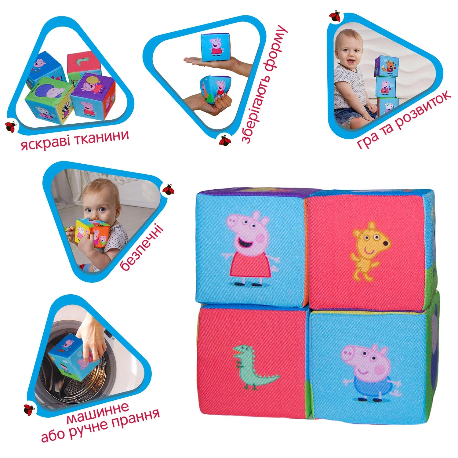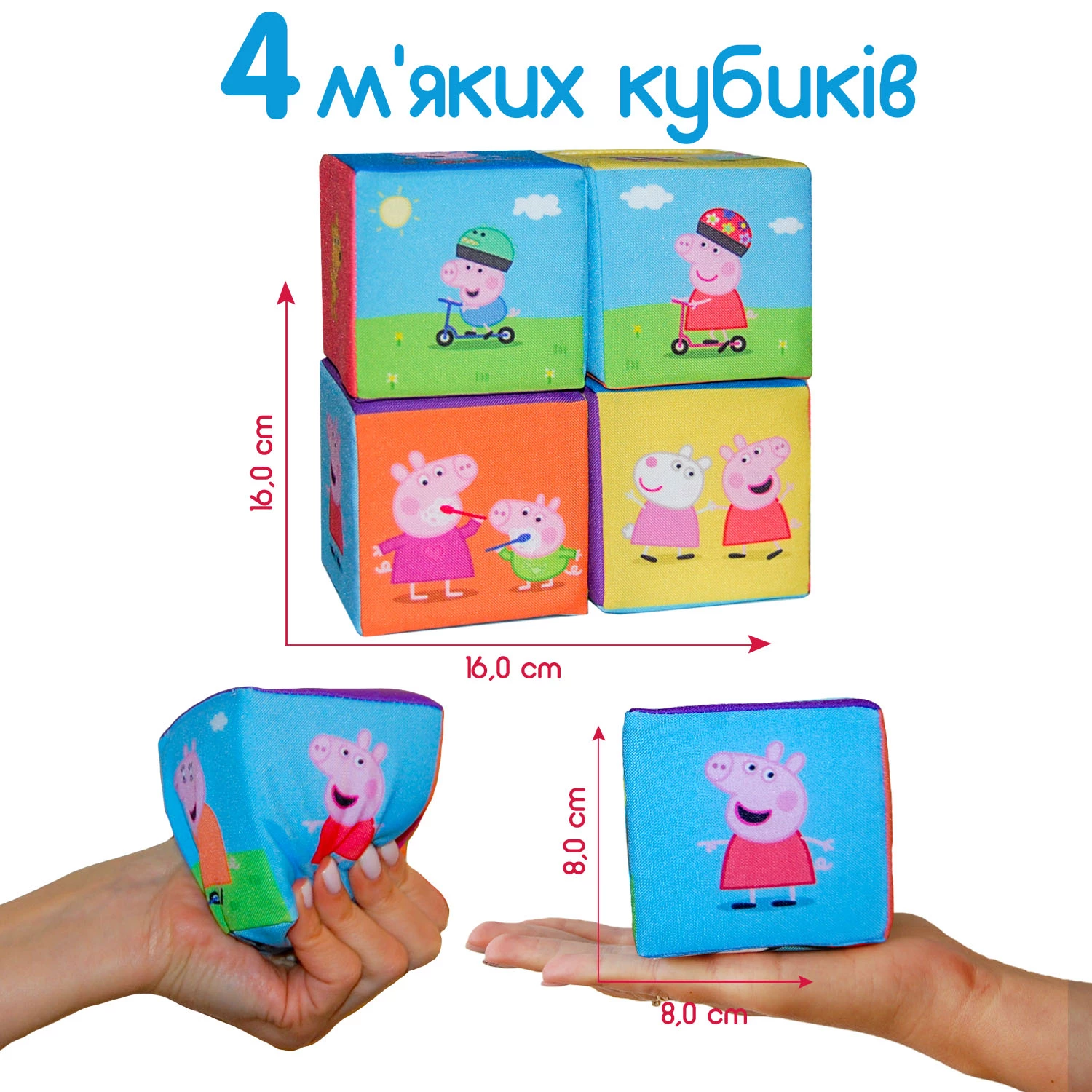 Набір кубиків «Свинка Пеппа» подарує малюкам радість та море позитивних емоцій. Кожна грань кубиків прикрашена зображеннями персонажів відомого мультсеріалу. Матеріали, з яких зроблена іграшка, повністю безпечні для дитячого здоров'я. Ще одна перевага представлених кубиків — відсутність гострих кутів.