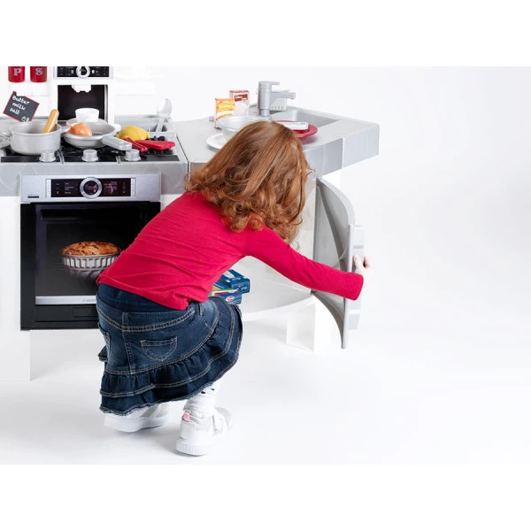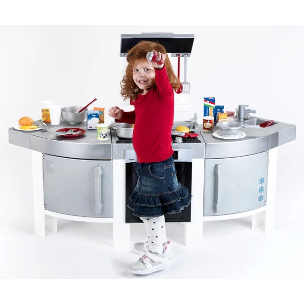 Двосторонній кухонний гарнітур має реалістичний модерновий дизайн, ретельно продумана кожна дрібниця. У набір також входить стильна духова шафа, витяжка, мікрохвильова піч і кавоварка. Ігрова кухня оснащена звуковими ефектами приготування їжі, мерехтливим світлом та справжнім водяним насосом, що подає воду в кран. Включено в набір і всіляке кухонне начиння: сковороду, каструлю з кришкою, друшляк, дерев'яні ложки, кулінарну лопатку тощо. Для подачі готових страв передбачено столовий набір на 2 персони: тарілки, виделки, ложки та ножі. Реалістичність грі додають іграшкові продукти, такі як м'ясо, ковбаса, яйце, борошно і цукор.