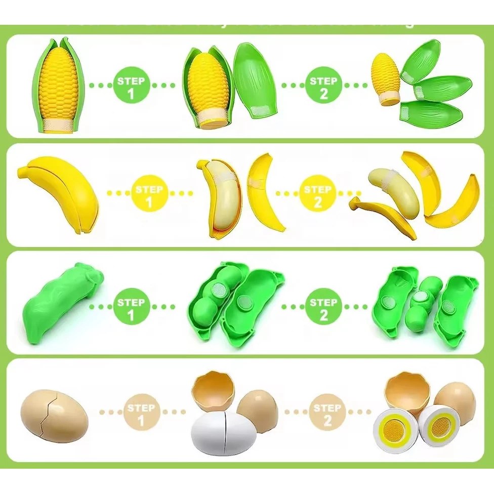 Багато фруктів та овочів (як-от кавун, морква, яйця) складаються з двох частин, скріплених липучкою. У комплект входять іграшкові ножі та дощечки, що дозволяють дитині "нарізати" продукти. Це ідеально тренує дрібну моторику та координацію "рука-око".