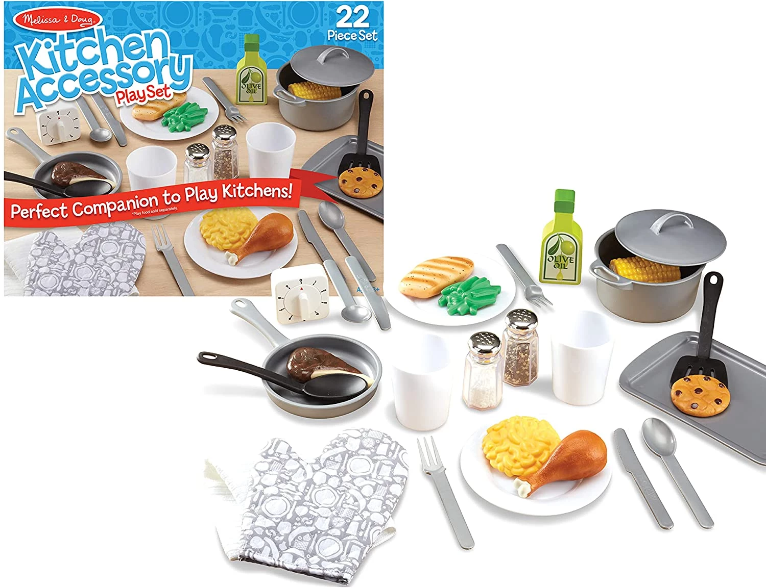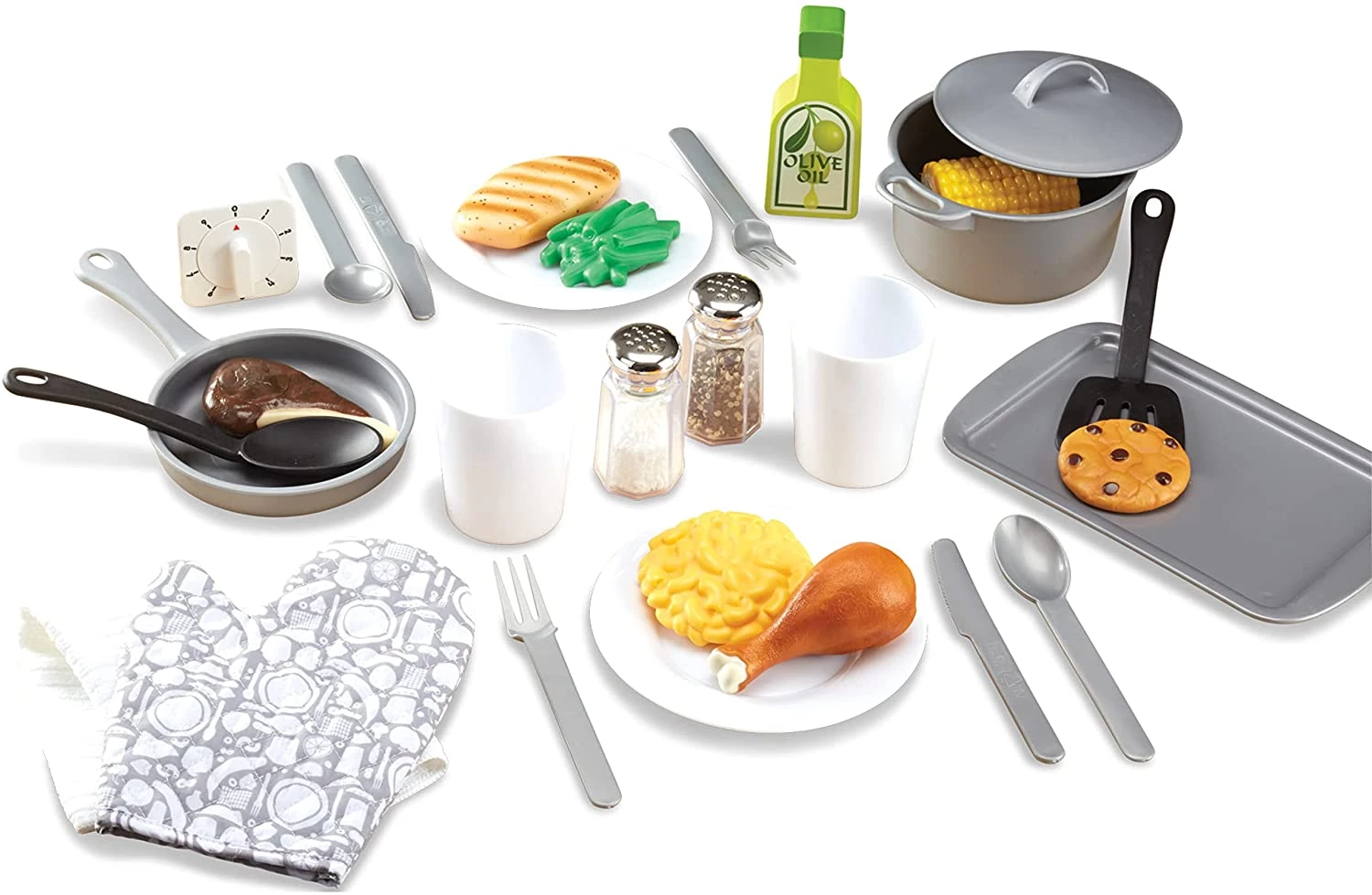 Цей ігровий набір складається з 22 елементів: сковорода, вилки, чашки, тарілки, шпатель, деко і багато іншого приладдя. Він призначений для різних ігор, дитина зможе уявити себе кухарем або власником ресторану. Використовуючи таку безпечну начиння можна навчити малюка сервірування столу, особливостям застосування того чи іншого приладу і тд. Такий комплект може стати відмінним подарунком на будь-яке свято.