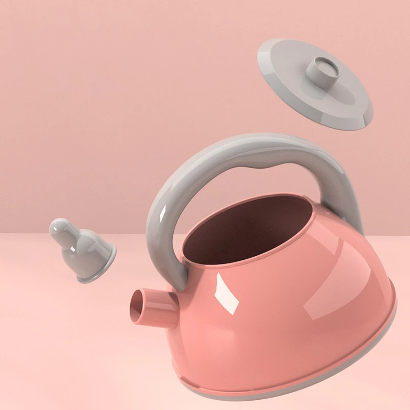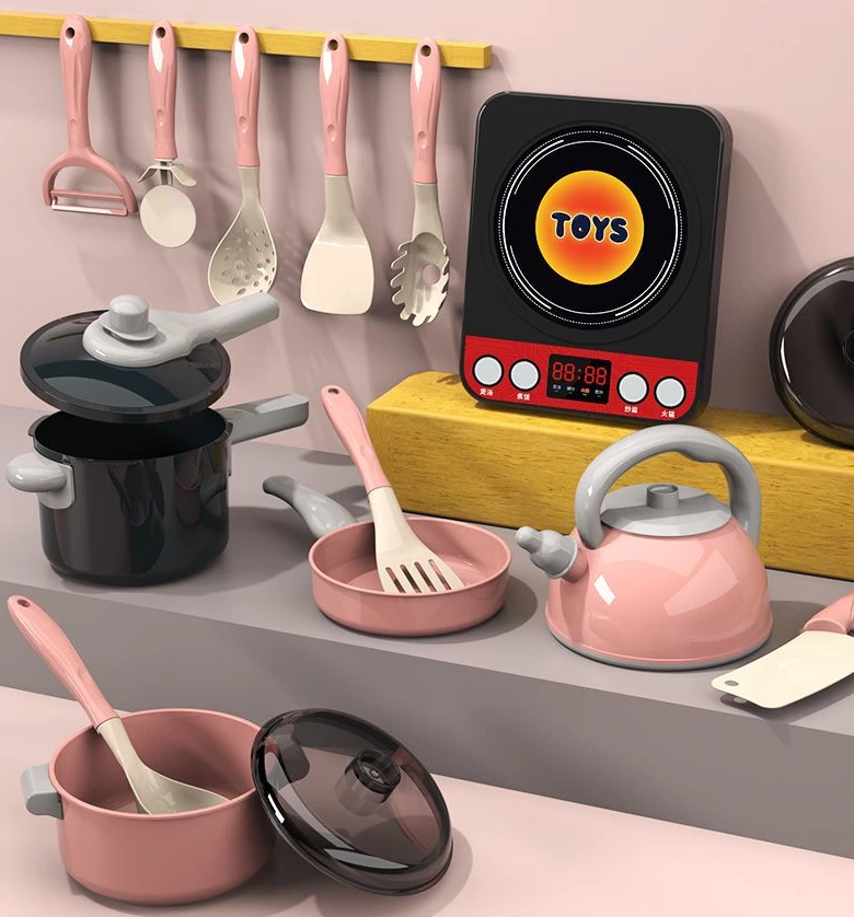 В комплект входить повний арсенал кухонного приладдя у стильних рожево-чорних кольорах. Це каструлі та сковорідки з кришками, чайник, кухонні дошки, а також повний набір приладів для готування (черпаки, лопатки, шумівки), які можна підвісити на спеціальній панелі.