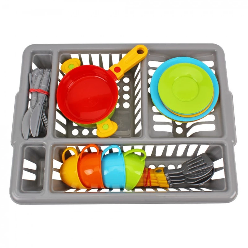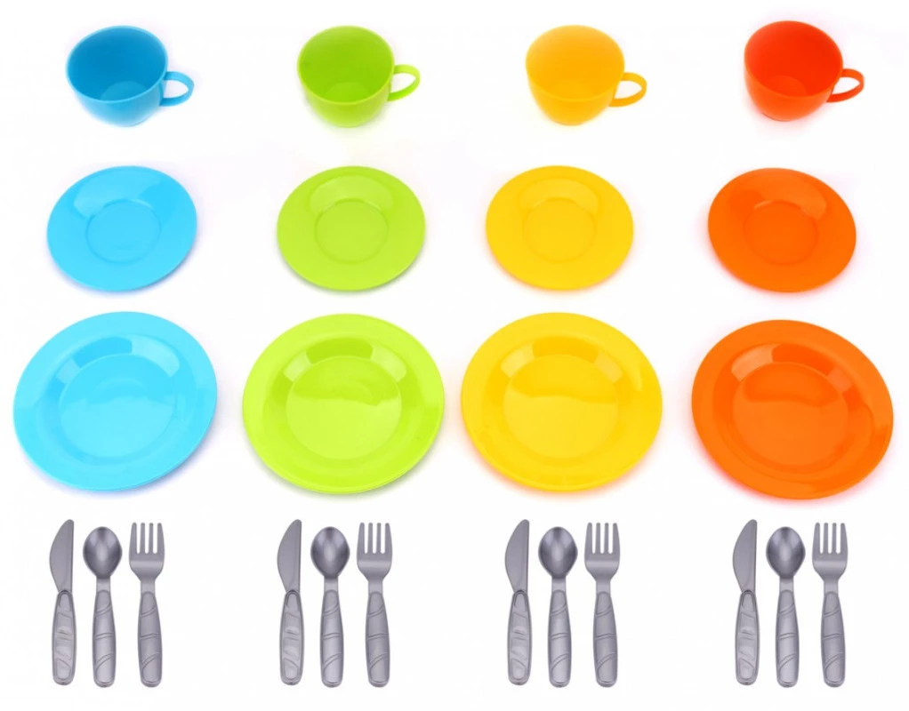 Іграшки, які входять у представлений набір, виготовлені з якісного пластику, який не має запаху та не містить фталатів та BPA, а це означає, що дитина може безтурботно грати з цим посудом.