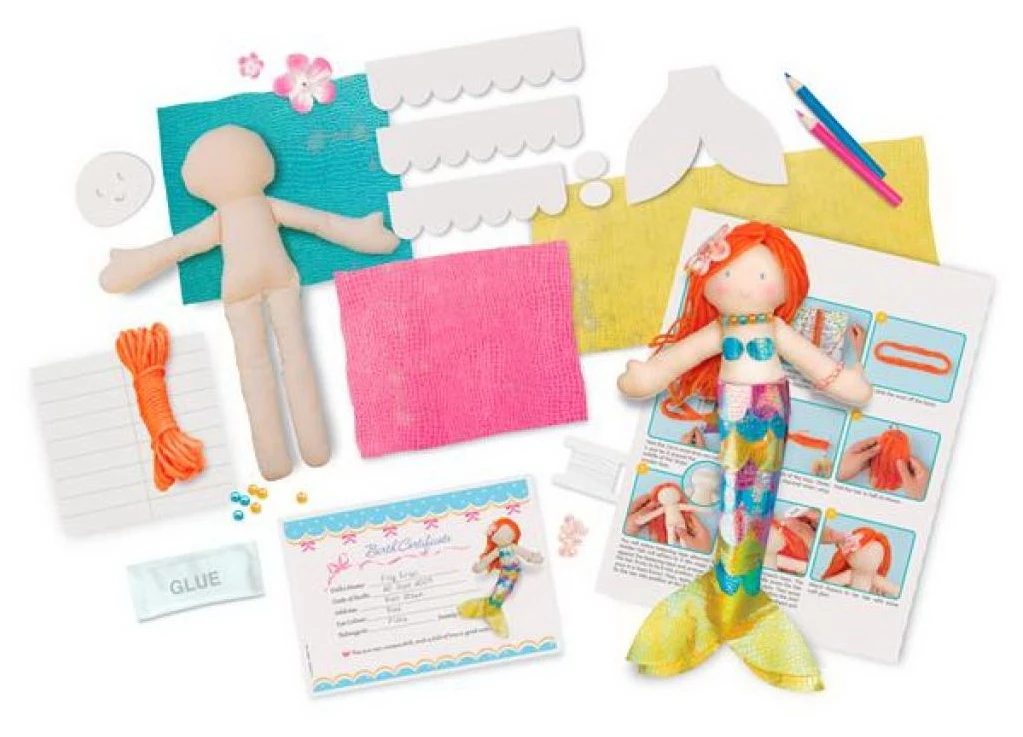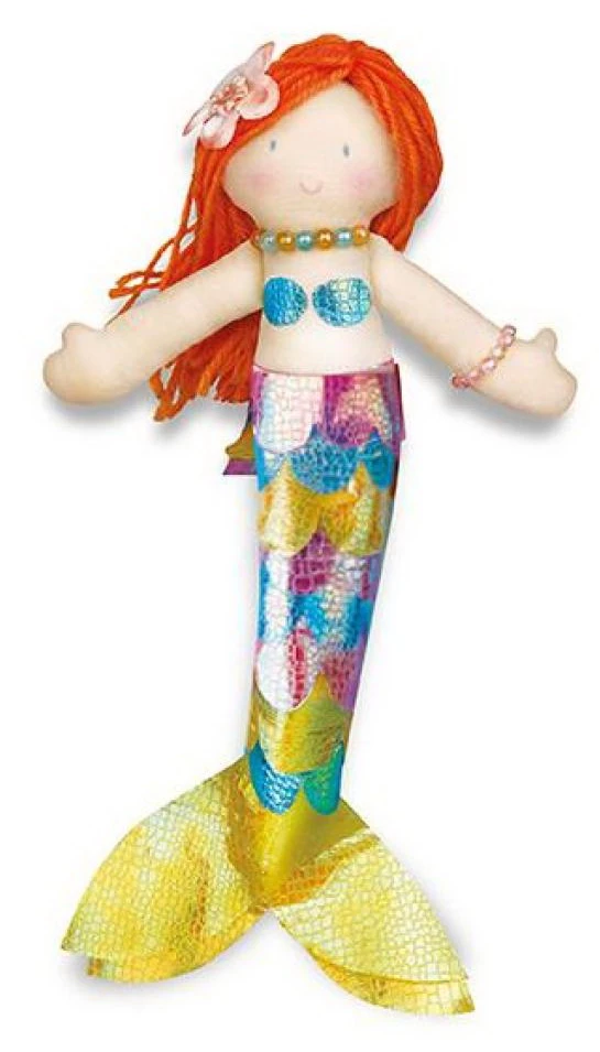 Цей набір не залишить байдужим жодну дитину. Дайте своїй дитині можливість створити м'яку ляльку у вигляді русалки. З яскравих ниток можна зробити волосся і плаття будь-якого кольору. Прикрасити одяг різними декоративними елементами і намалювати обличчя для ляльки включивши уяву або використовуючи трафарет. У комплекті є докладна інструкція, в якій все детально показано і написано.