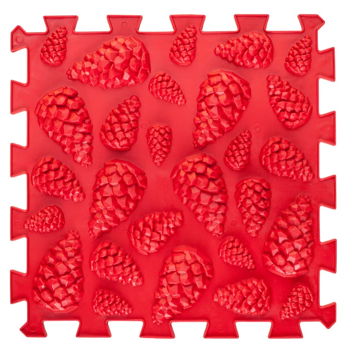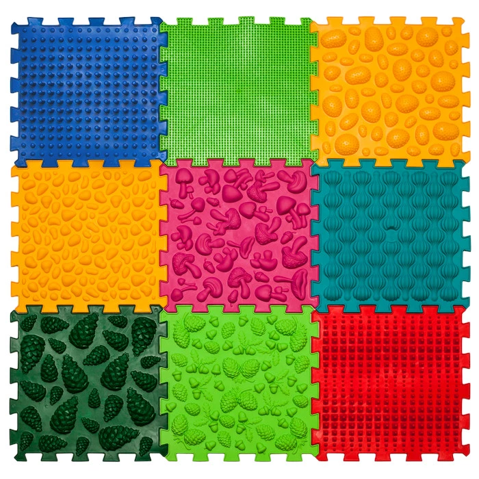 Усі модулі килимка виконані із безпечного, гіпоалергенного ПВХ без шкідливих домішок. Завдяки різним текстурам килимок відчувається по-різному. Травка, черепашки, галька та гриби належать до більш м'яких пазлів. Башти, їжачки, жолуді - до середніх. Піраміда, шипи, лотос, шишки належать до більш твердих пазлів. Вплив поверхонь різної твердості має найкращий масажний ефект.