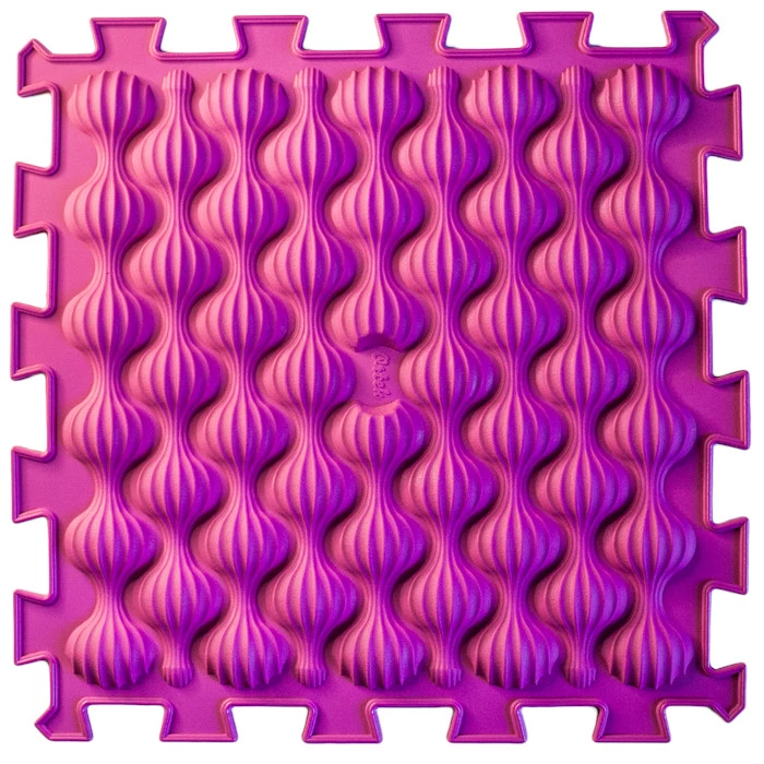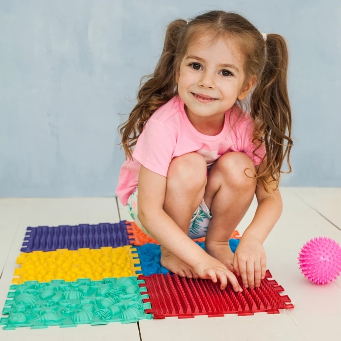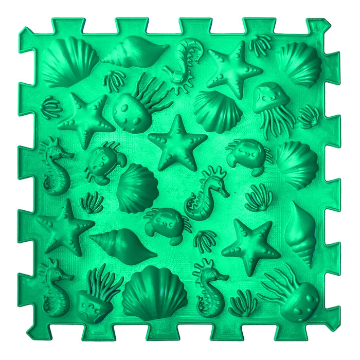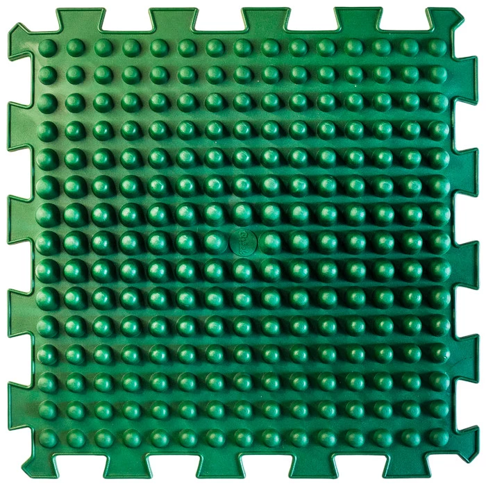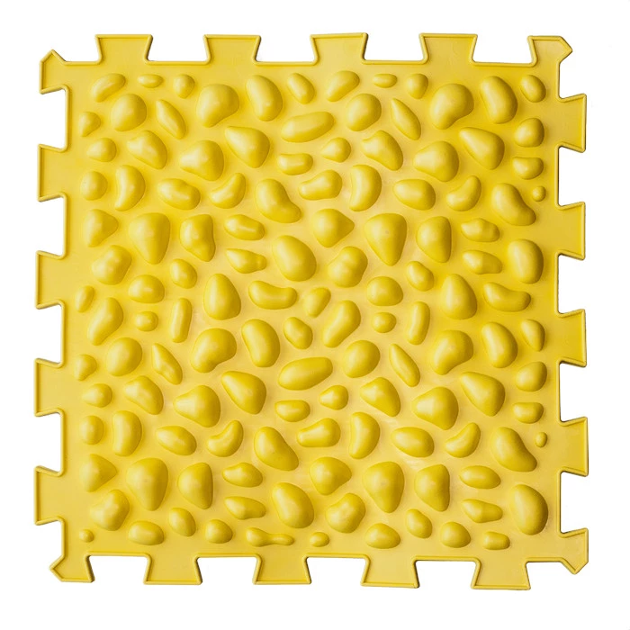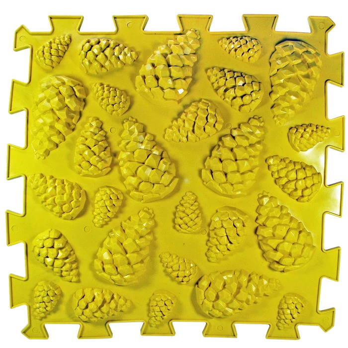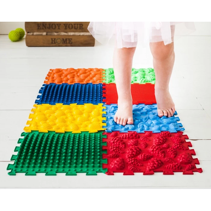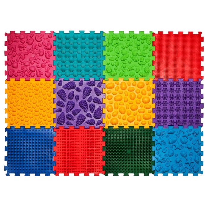 Всі пазли, з яких складається даний масажний килимок, виконані з високоякісного гіпоалергенного матеріалу ПВХ без шкідливих добавок. Завдяки різним текстурам килимок відчувається по-різному. Травка, мушлі, галька, гриби належать до м'яких поверхонь. Башти, їжачки та жолуді належать до середніх пазлів. Піраміда, шипи, лотос, а також шишки відносяться до більш твердих пазлів. Вплив поверхонь різної твердості забезпечує ефективний масаж, тренування стоп та сенсорну інтеграцію.