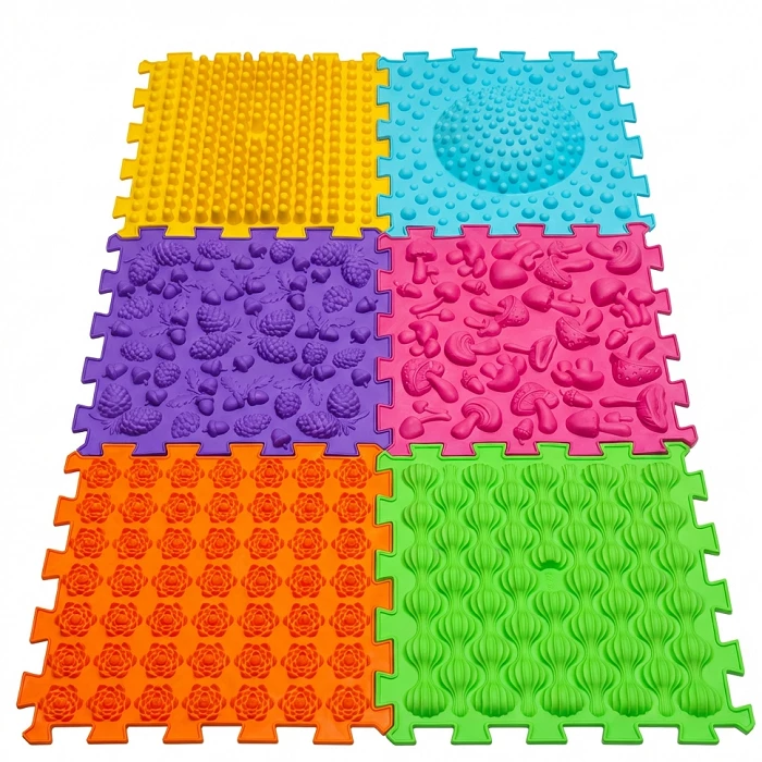 Всі елементи виготовлені з безпечного гіпоалергенного ПВХ без шкідливих домішок. Пазли різняться за жорсткістю: від м'яких текстур на кшталт «Травки» або «Черепашок» до твердих поверхонь «Піраміда» та «Шишки». Саме чергування м'яких, середніх та твердих модулів створює оптимальне навантаження для тренування стоп. Для досягнення видимого результату достатньо займатися 3-5 разів на тиждень, і вже через місяць ви помітите позитивні зміни в поставі та ході дитини.