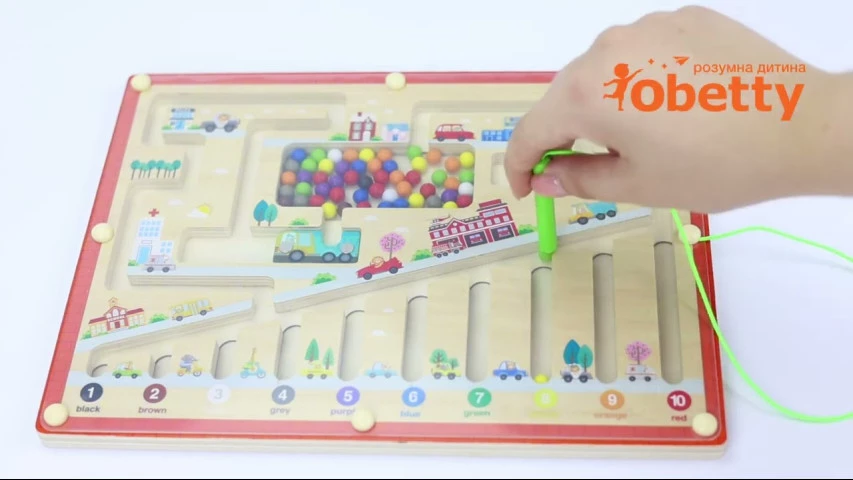 Ця дерев'яна іграшка складається з дошки, різнокольорових магнітних намистин та спеціальної магнітної палички. Ідеально підходить для розвитку дрібної моторики та зорово-моторної координації. Дитині необхідно використовувати магнітний стрижень та спеціальні перегородки, щоб притягувати кульки відповідного кольору та кількості та доставляти їх у правильні комірки. Це не тільки іграшка, але й відмінний навчальний інструмент для зіставлення кольорів та рахунку. Головоломка розвиває у дітей терпіння, акуратність та уважність. Чудова заміна гаджетам.