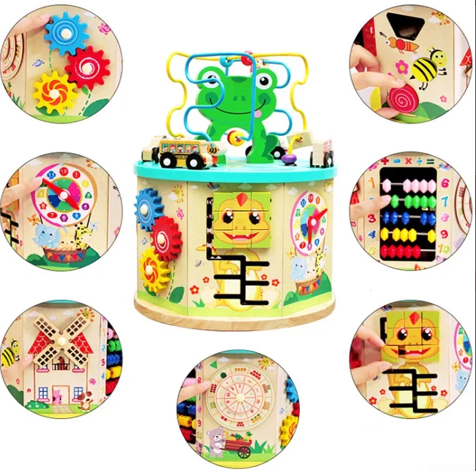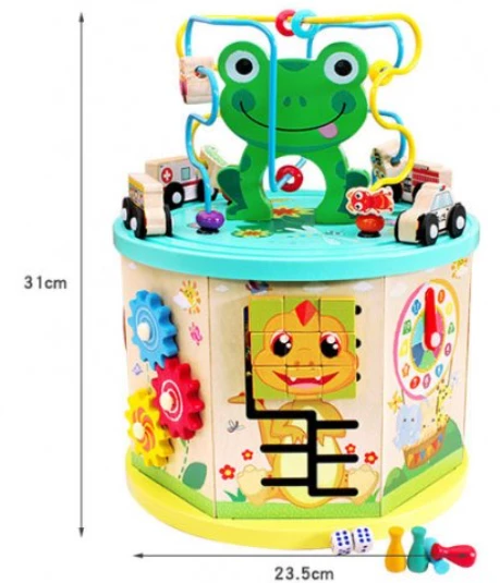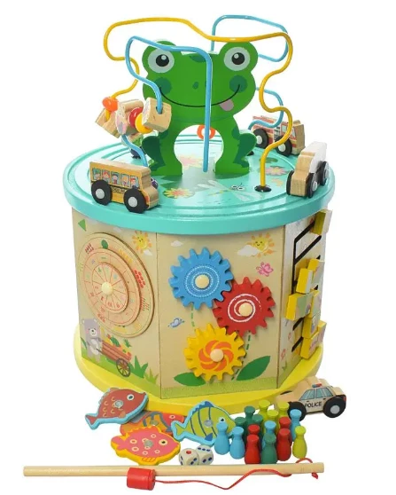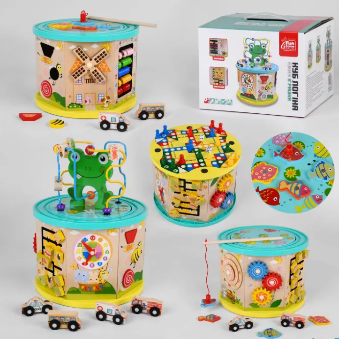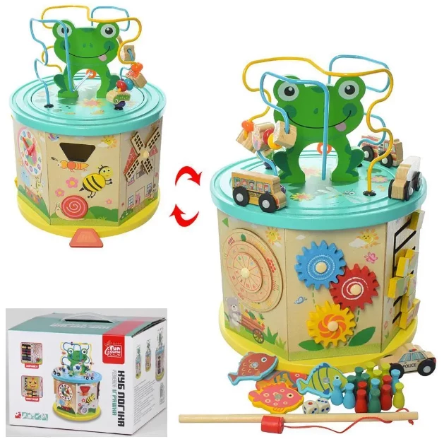 Багатофункціональна гра прекрасно розважить вашого малюка і позитивно вплине на розвиток. Пальчиковий лабіринт, сортер, годинник з обертовими стрілками, шестерні і кубики, рахівниці, геометричні фігурки, магнітна рибалка ідеально привернуть увагу малюка. Добре розвиває логіку, моторику рук, кмітливість, спритність і багато іншого що допоможе в правильному і якісному розвитку дитини. Гра зроблена з міцного і натурального дерева і пофарбована яскравими і безпечними фарбами.