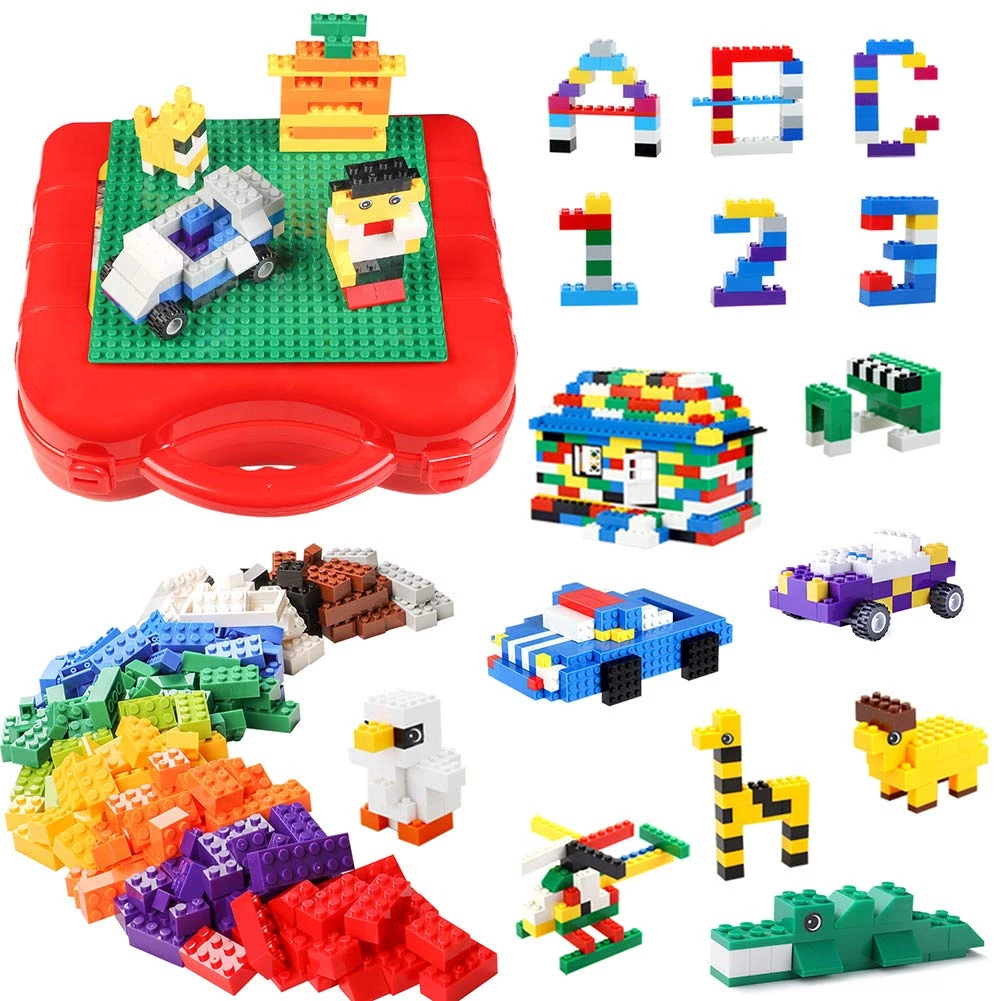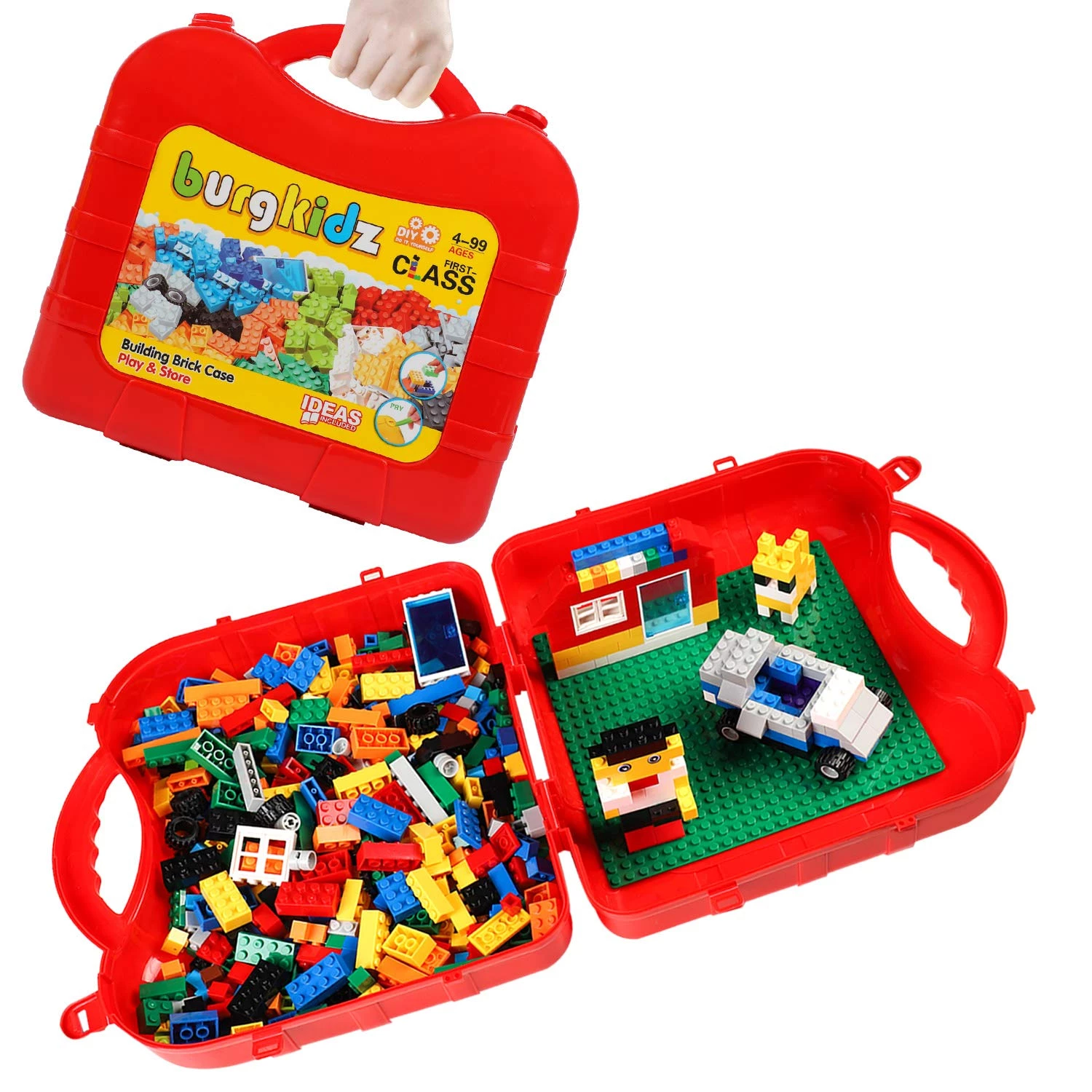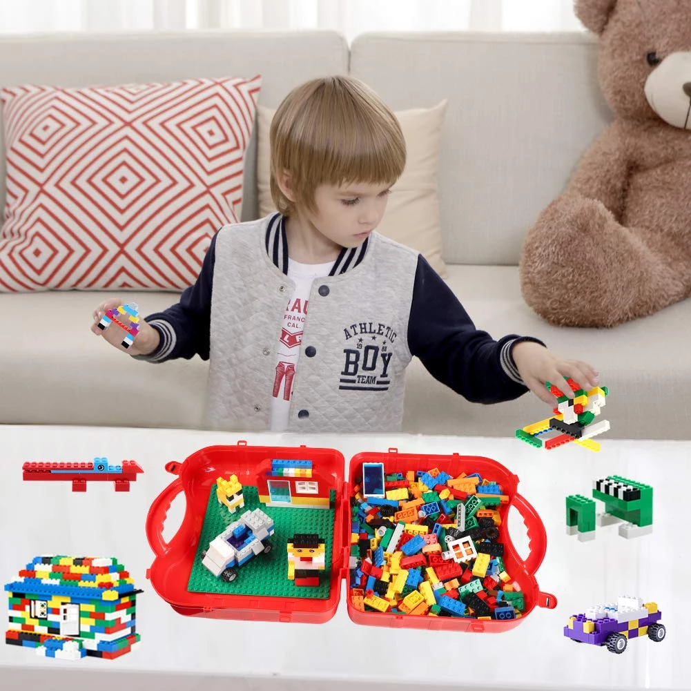 Красный чемоданчик содержит 518 строительных блоков и 1 игровую плиту на которой можно собирать фигуры. Сам чемоданчик достаточно большой, чтобы вместить более 1000 строительных блоков.
