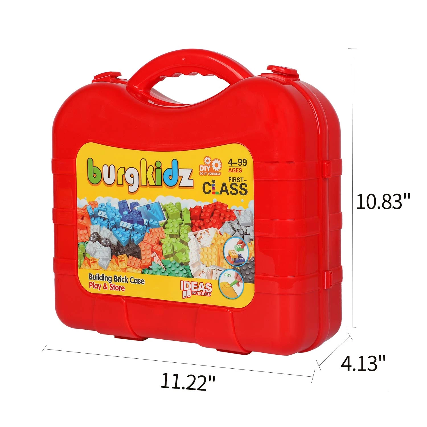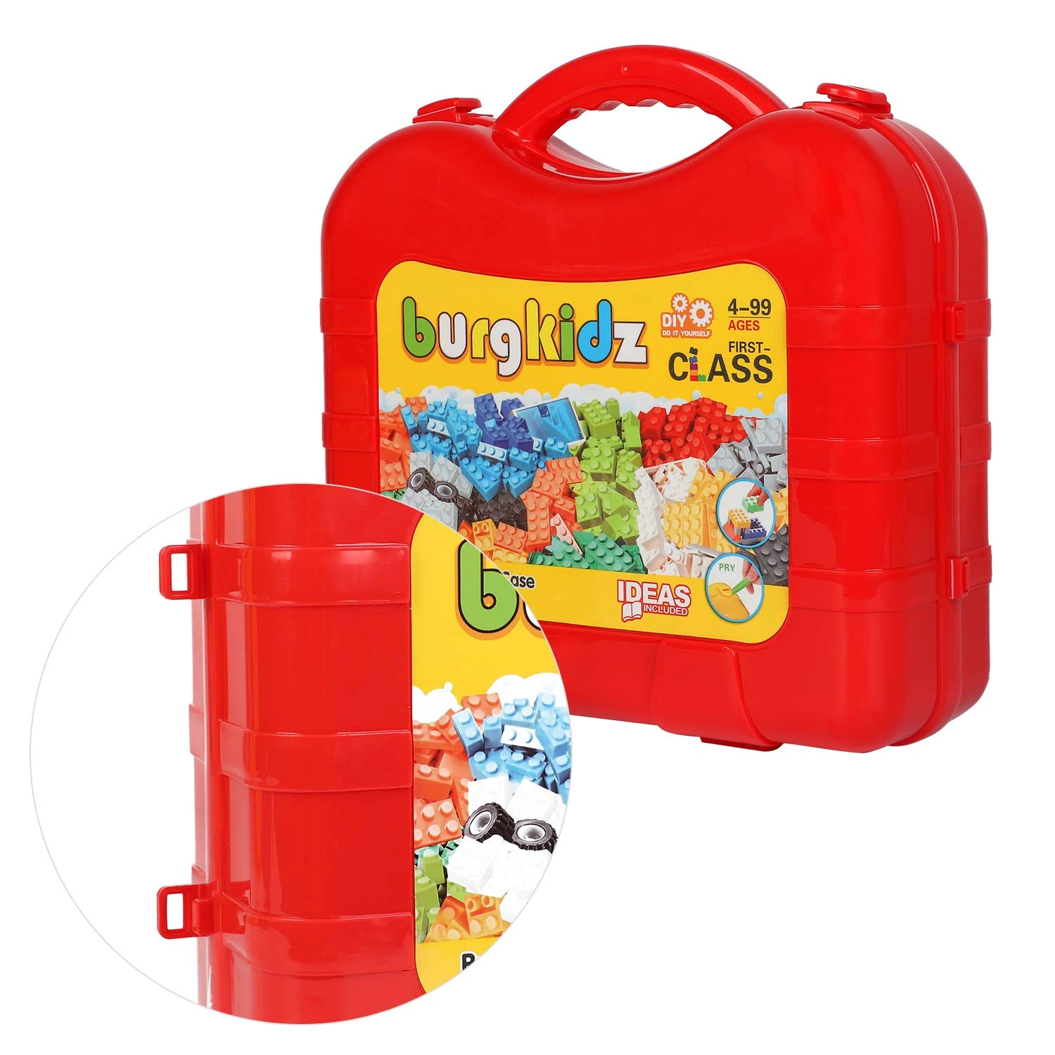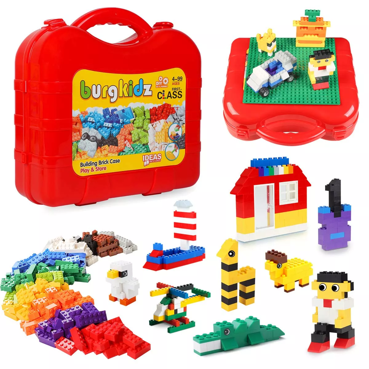 Красный чемоданчик содержит 518 строительных блоков и 1 игровую плиту на которой можно собирать фигуры. Сам чемоданчик достаточно большой, чтобы вместить более 1000 строительных блоков.