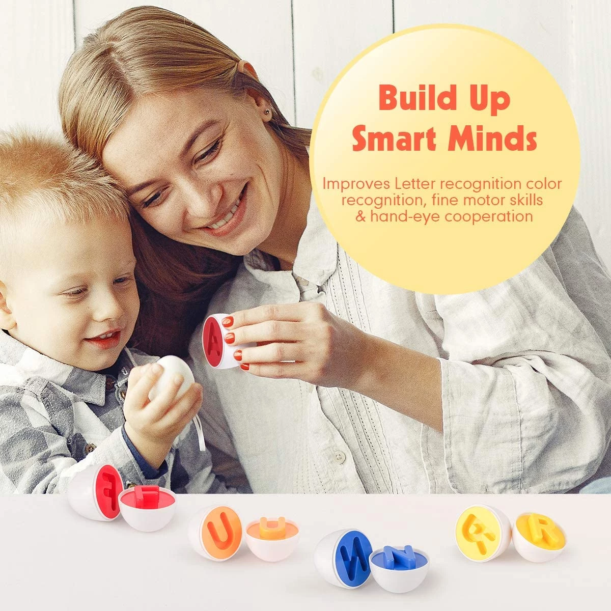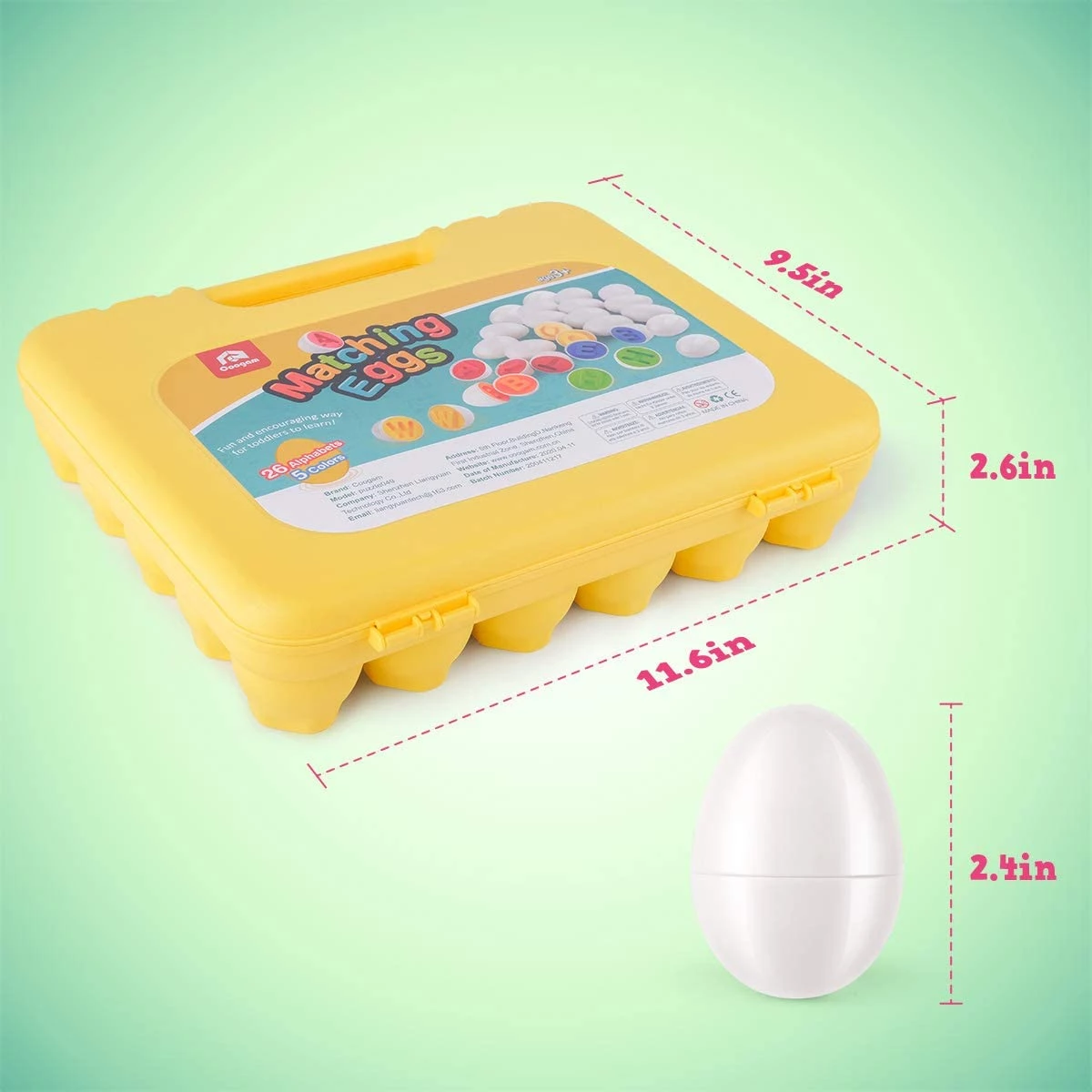 Набір відповідає всім стандартам якості ASTM, CPISA, EN71, CPC. Лоток і яйця зроблені з нетоксичних матеріалів, можна мити в гарячій воді. Всі краї гладкі і безпечні для дітей. Міцний корпус і яйця дозволяють використовувати цей набір навіть під час активних ігор. З таким набором можна придумати безліч ігор. Наприклад, розділити всі яйця на половинки і перемішати. Дитина може впорядкувати їх за кольором, або зібрати за алфавітом.