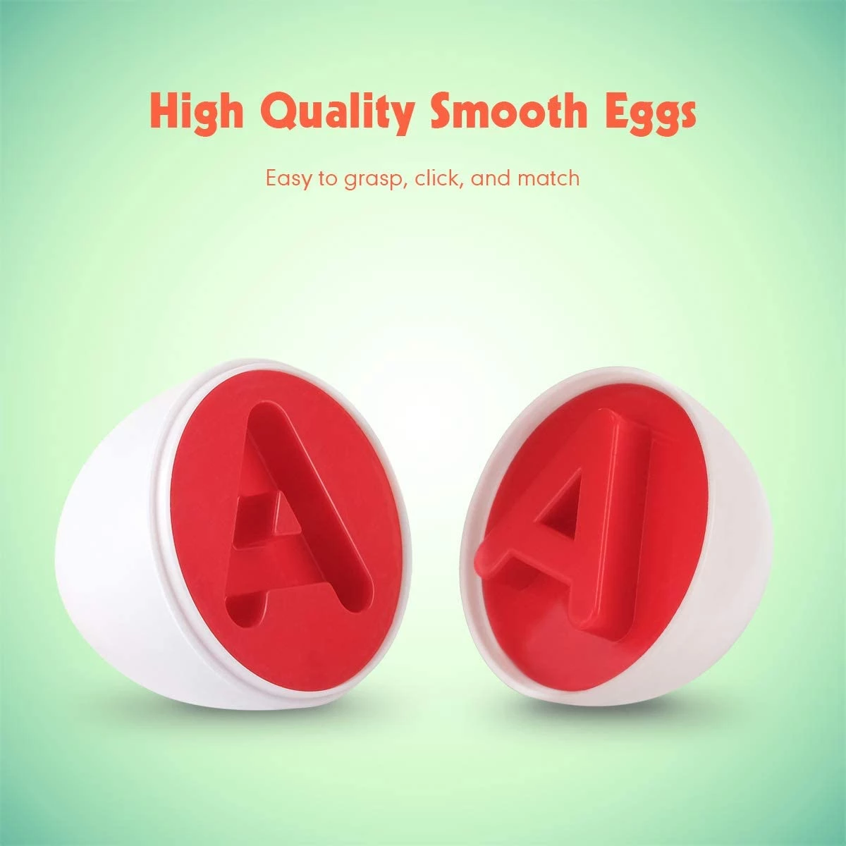 Захоплюючий набір яєць для вивчення англійського алфавіту. 26 білих яєць в реалістичному жовтому лотку відразу привертають увагу дітей. Одна половинка яйця з випуклою буквою, друга з поглибленням цієї літери. Всього в наборі 5 кольорів: червоний, синій, жовтий, помаранчевий, зелений.