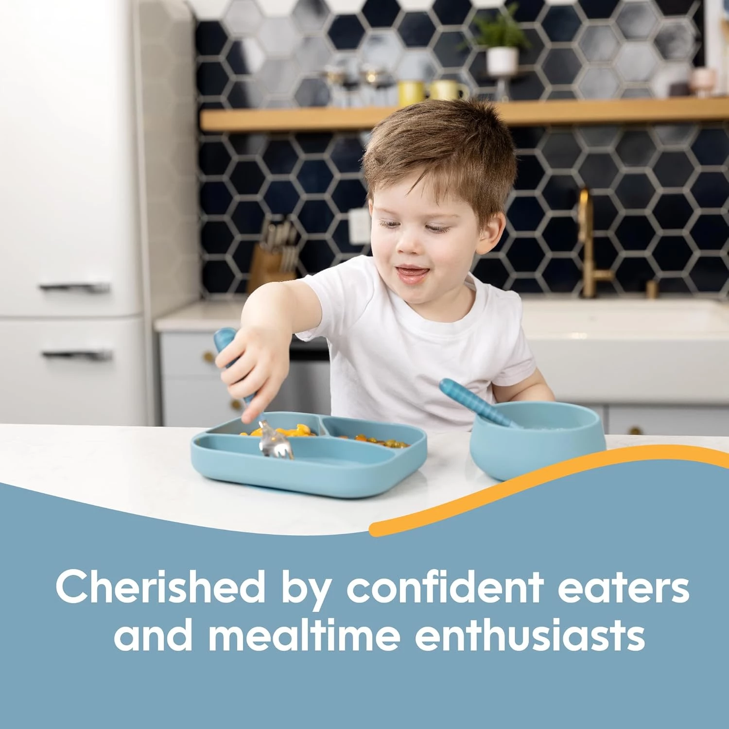 Набір виготовлений з харчового силікону та нержавіючої сталі та не містить бісфенолу A та фталатів. Цей посуд створений, щоб витримати інтенсивне щоденне використання та часте очищення, при цьому легко миється в посудомийній машині. Крім того, набір рекомендований ерготерапевтами як ефективний інструмент, який допомагає дітям навчитися розколювати, черпати та різати, роблячи процес навчання цікавим та продуктивним.