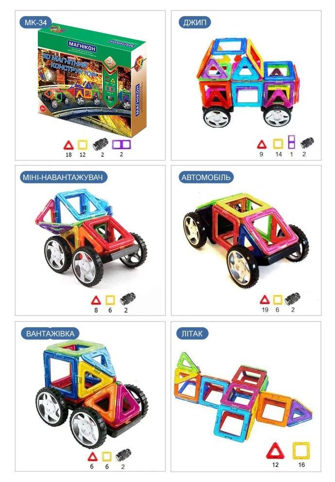 Здавалося б, усього лише 34 деталі магнітного 3Д конструктор Магнікон, а скільки різних варіантів виробів: вантажівка, літак, автомобіль, джип і навіть міні-навантажувач! Таке різноманіття забезпечено відразу декількома факторами.
