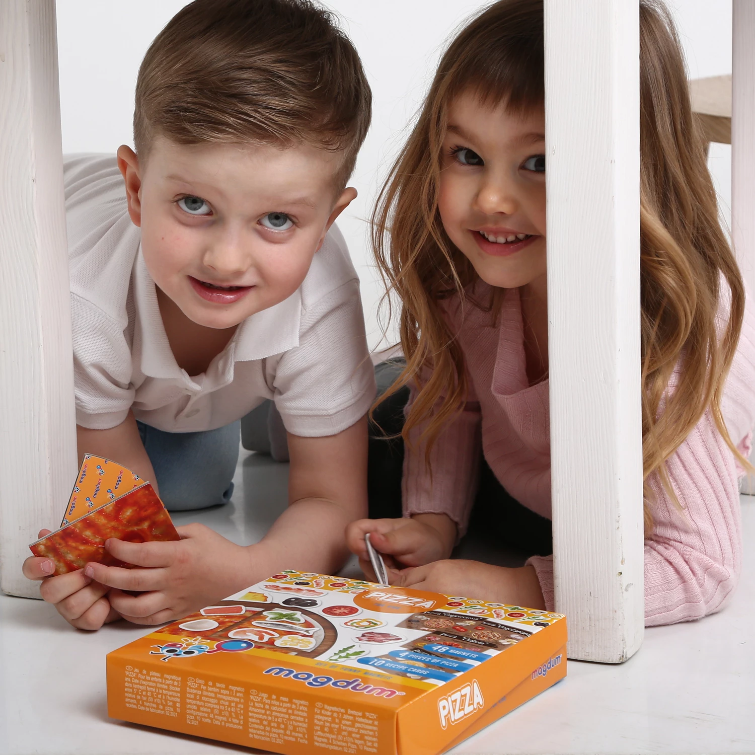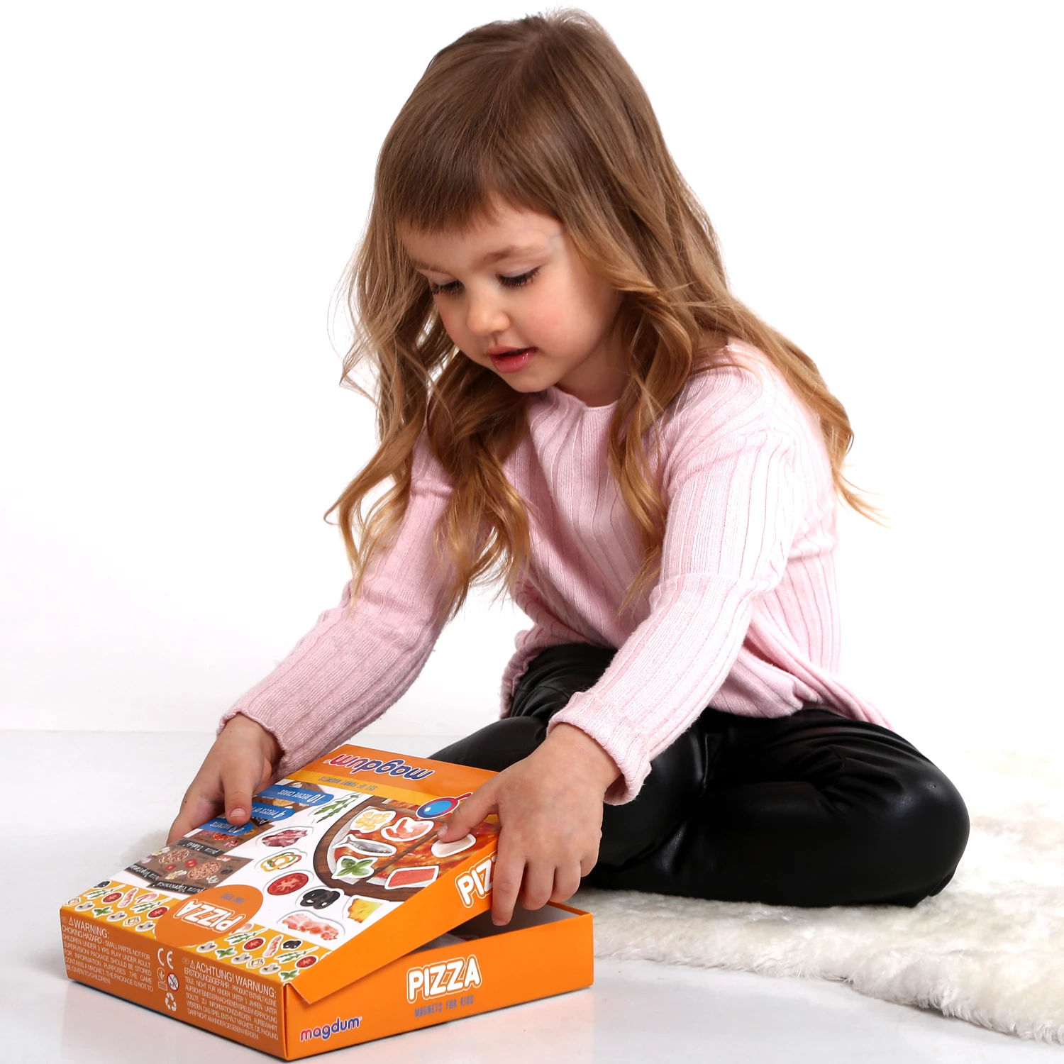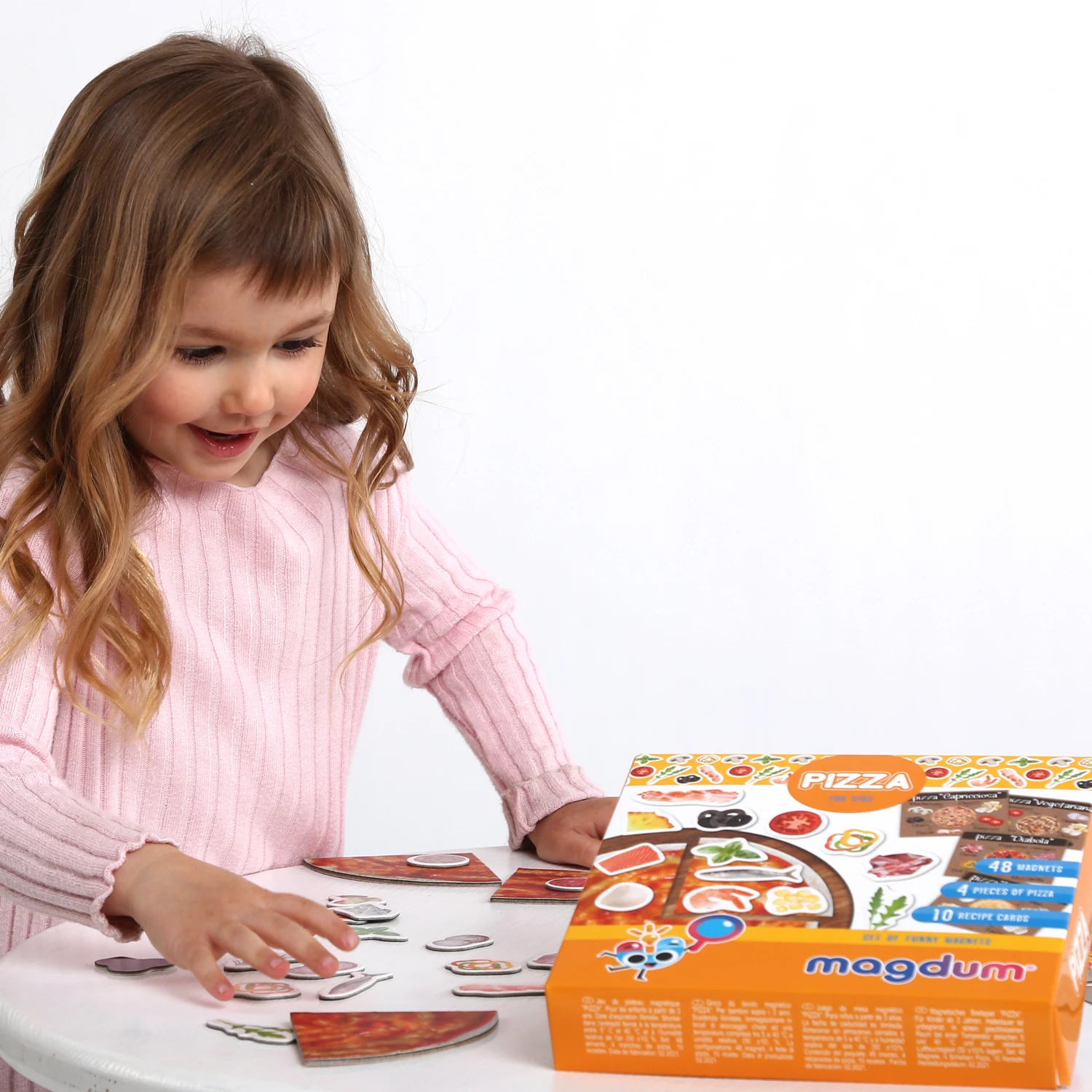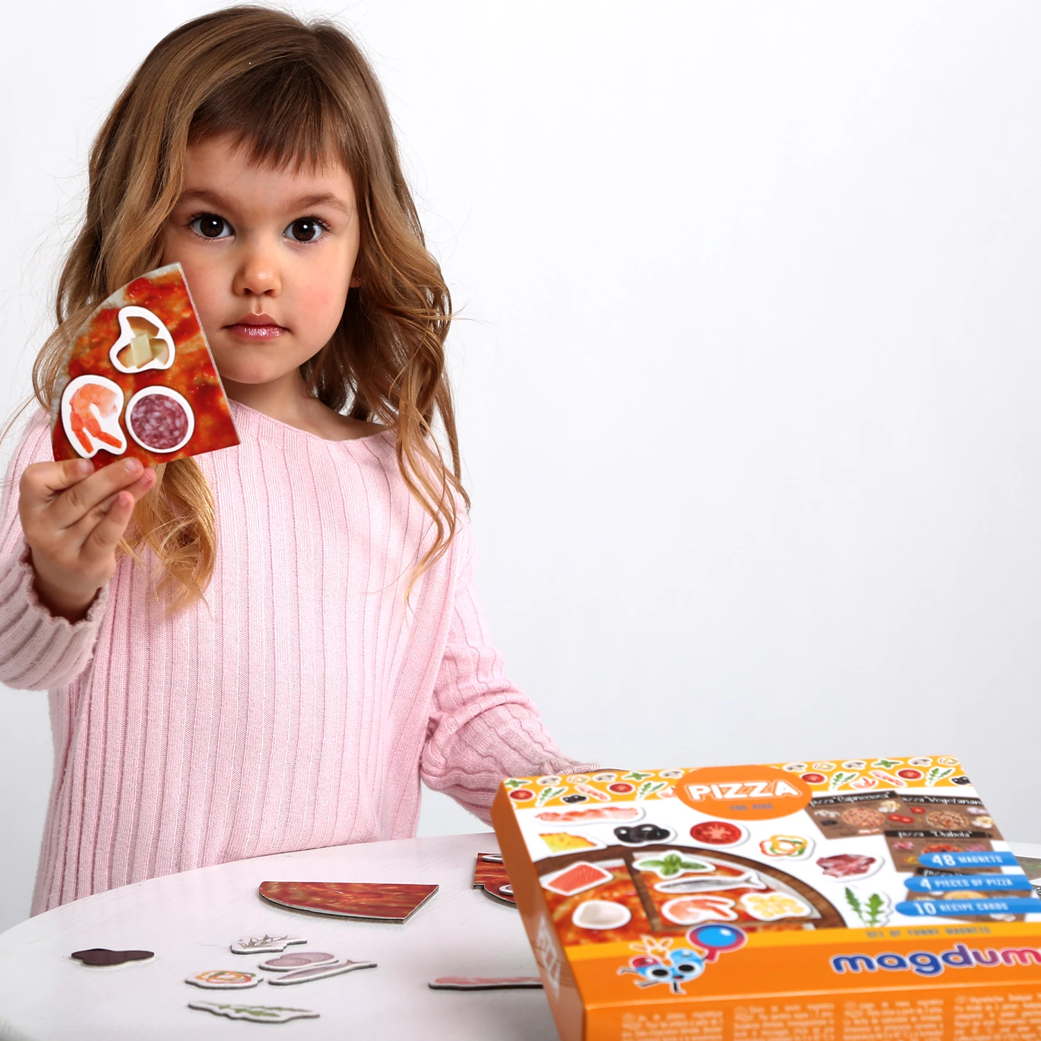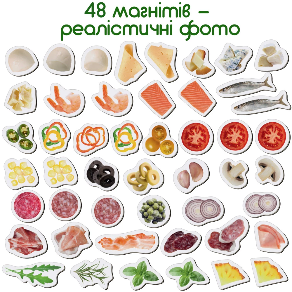Виявляй свої кулінарні таланти з магнітною грою «Піца». У яскравій коробці ти знайдеш 4 шматочки апетитної основи, 48 магнітів з зображенням інгредієнтів, а також 10 рецептів для приготування кулінарних шедеврів.